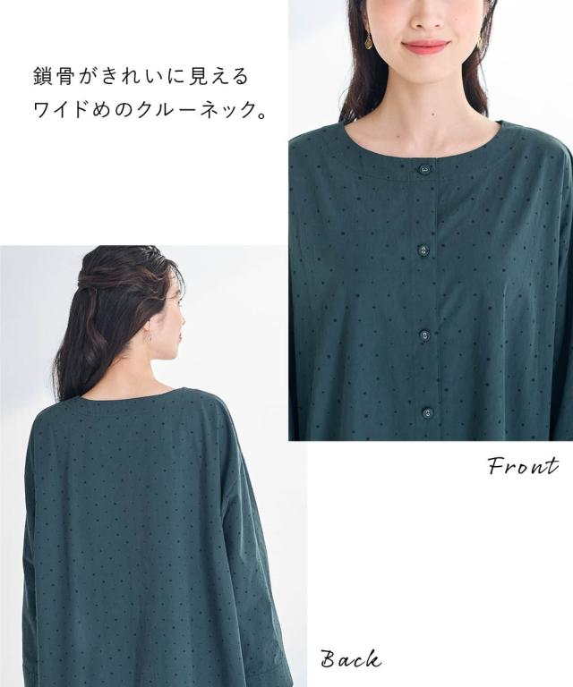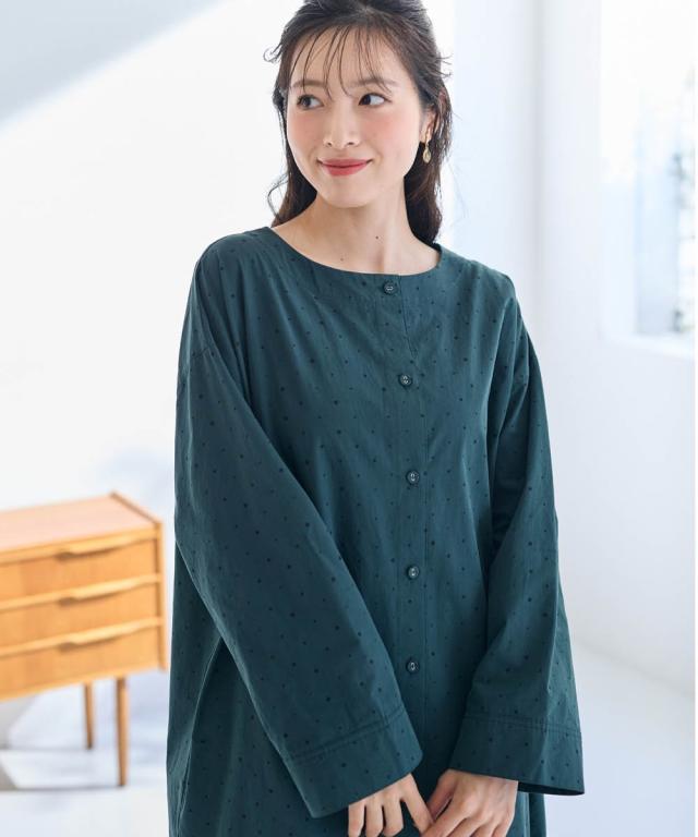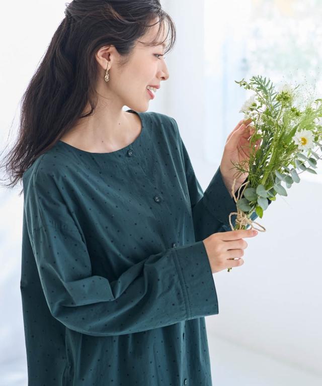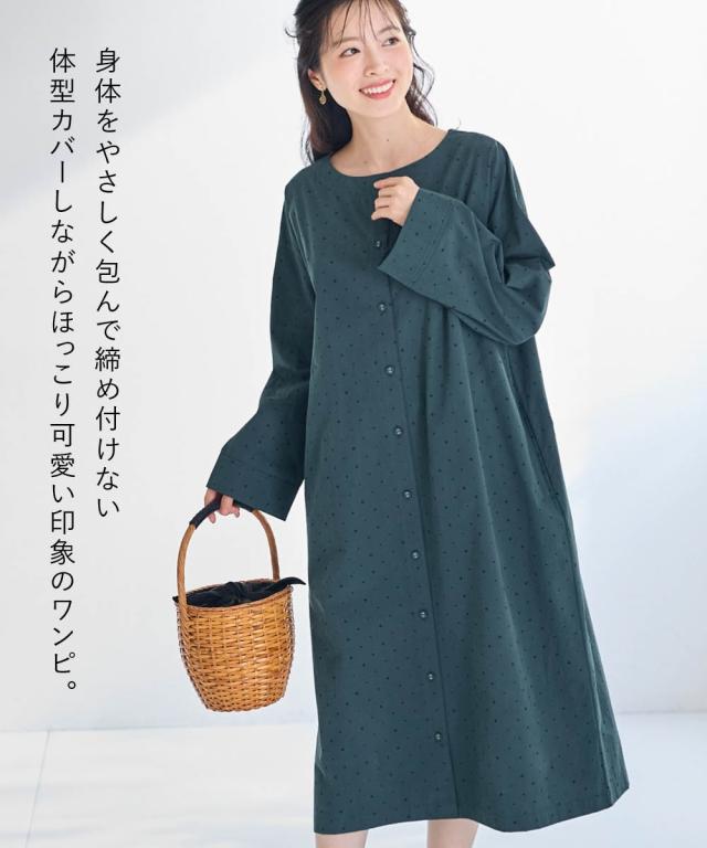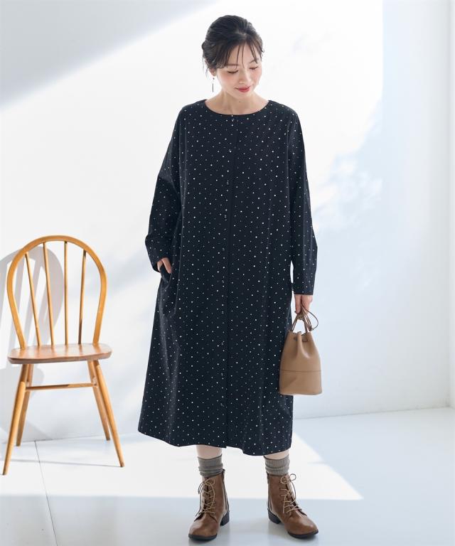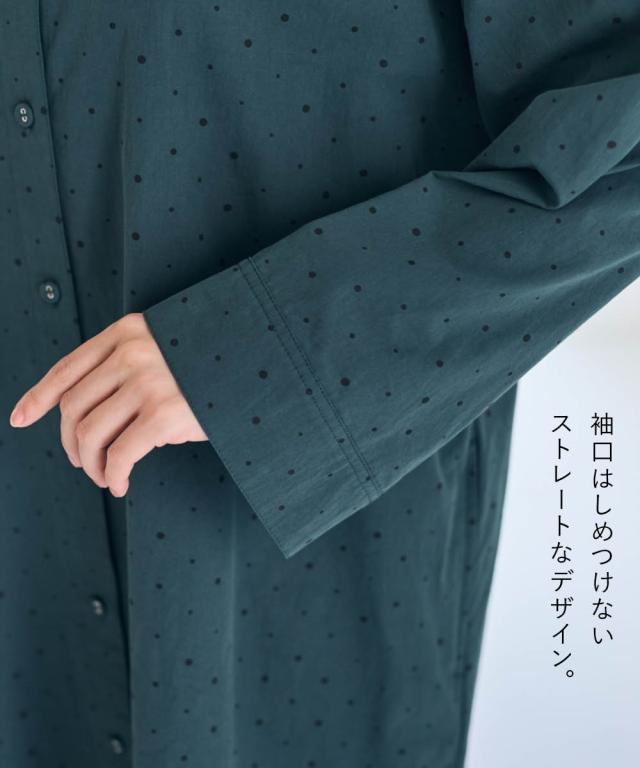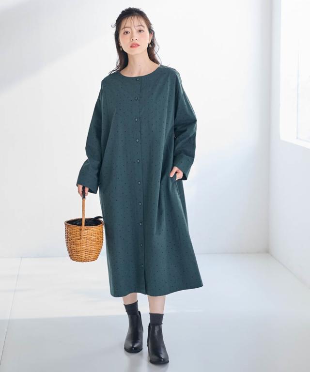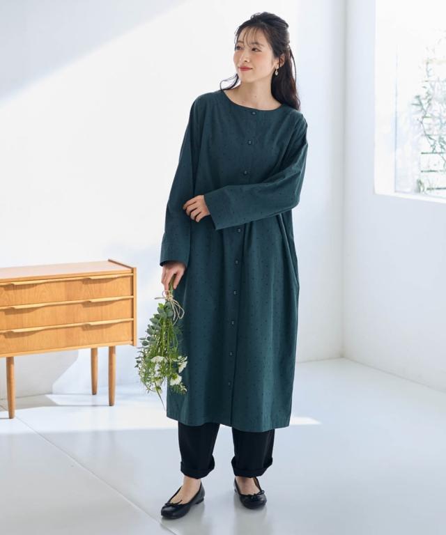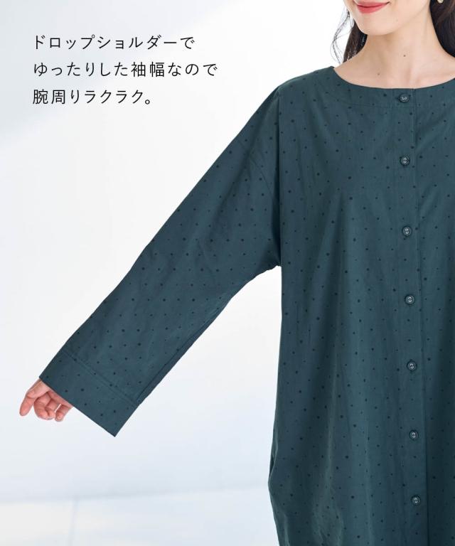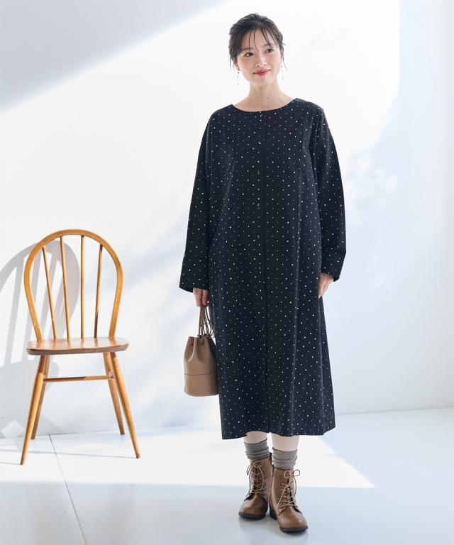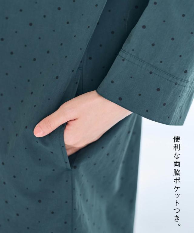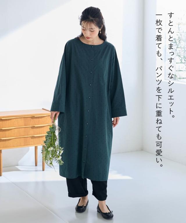 シンプルだけど私らしさもある。そんな大人のためのリラクシーワンピース。 ■デザイン 飽きのこない定番のドット柄が大人っぽく上品な印象に。ゆったりなシルエットが体型もカバーしてくれます。1枚でワンピース、前を開けて軽めのアウターとしても楽しめる着回し力抜群のお得感あるアイテムです。 ■素材 綿100%の柔らかな素材で着心地も抜群です。 ■おすすめのスタイリング ワンピースとしてはもちらん、さっと羽織ればアウターに早変わり。重ね着したり、違った雰囲気を楽しめる1着あれば重宝すること間違いなし!アイテムです。 〜 ナチュラル&カジュアル なオトナのデイリーウェア 豊かなライフスタイルと心地の良い毎日を 肌ざわりや着心地の良さはもちろん、シンプルさの中に自分らしさをプラスしたリラックスできるスタイルのご提案 〜