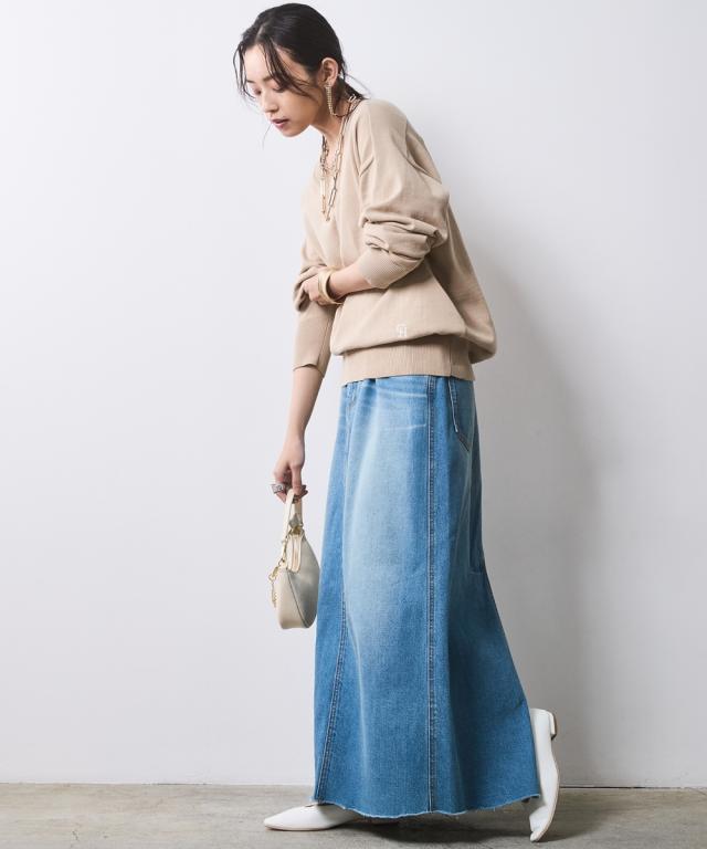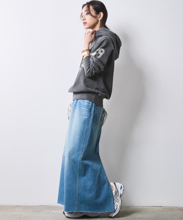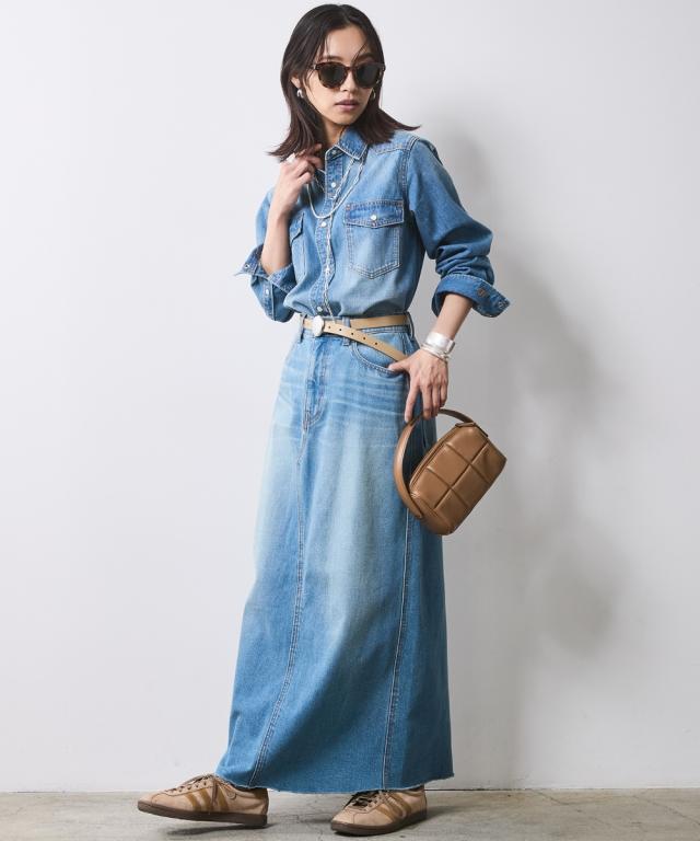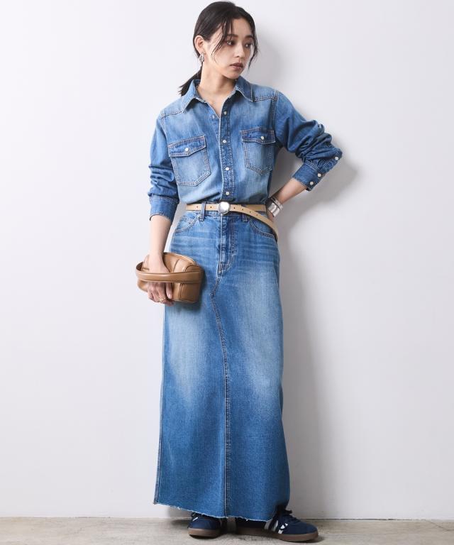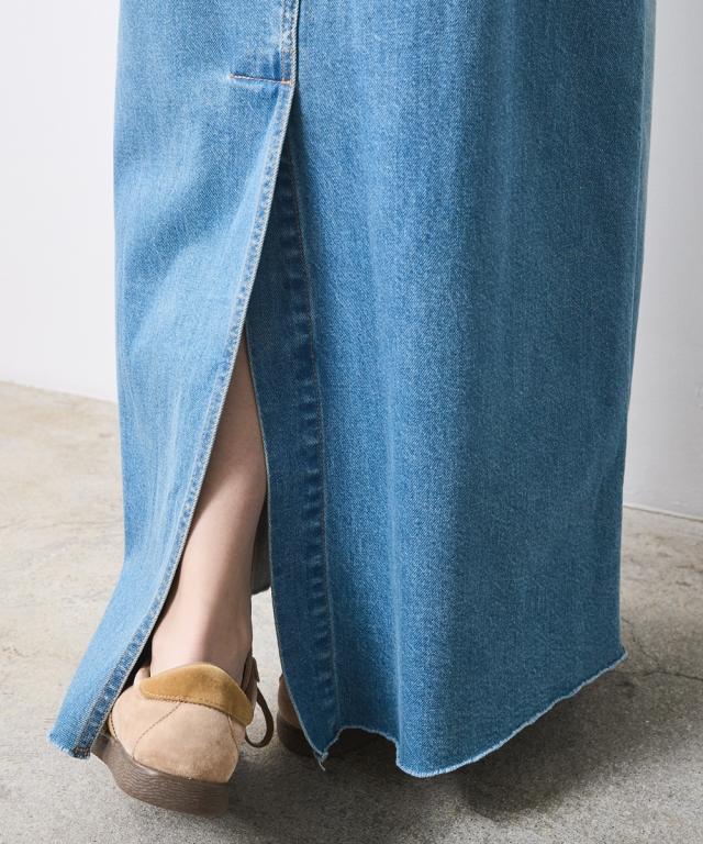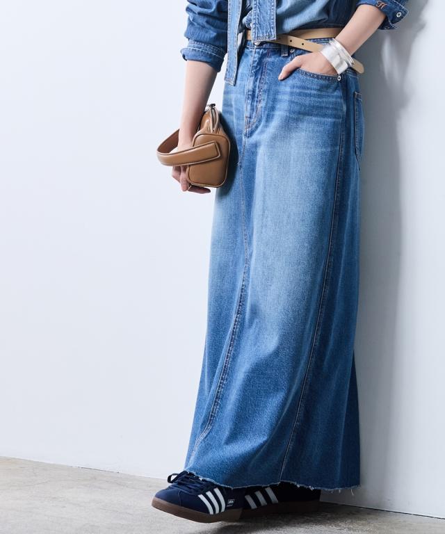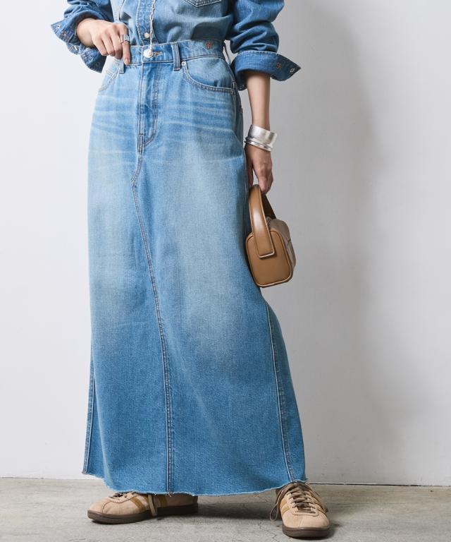 着心地抜群のデニムマキシスカート。 ■デザイン リメイク風デザインとヴィンテージ感を演出する加工が施されたデニム素材のスカートです。 体に程よくフィットするストレートシルエットが特徴で、スタイリッシュな印象を与えます。 後ウエストのゴム仕様と長めの後スリットで足さばき良く着心地抜群です。 ■素材 綿レーヨンの落ち感のある素材を使用しているのでソフトで肌触り良く、きれいなシルエットが出ます。 ■おすすめのスタイリング シンプルなデザインなので、どんなトップスとも相性が良く、日常のさまざまなシーンで活躍します。