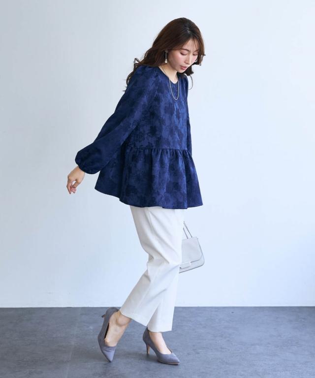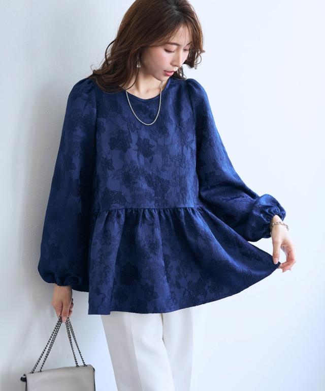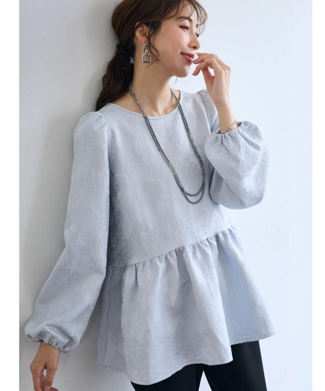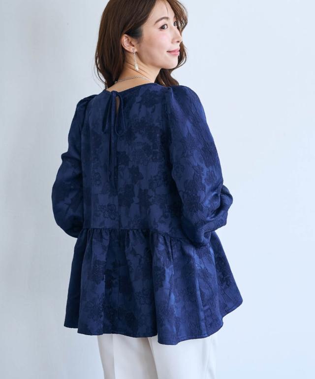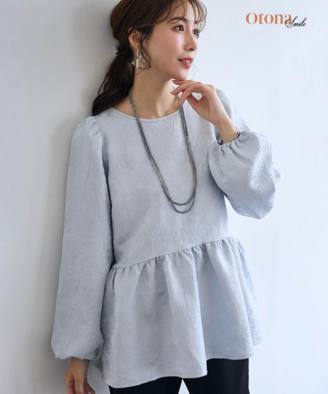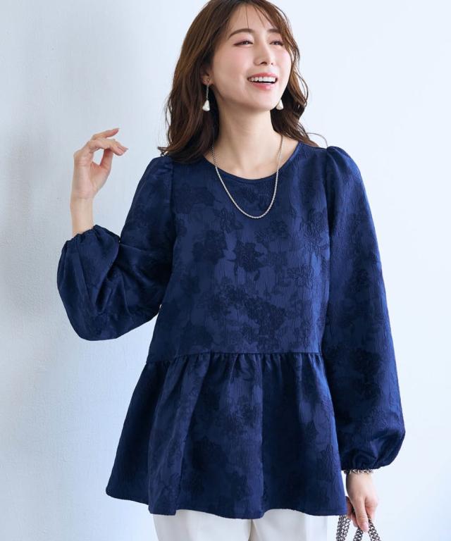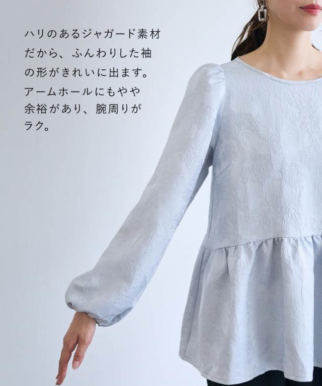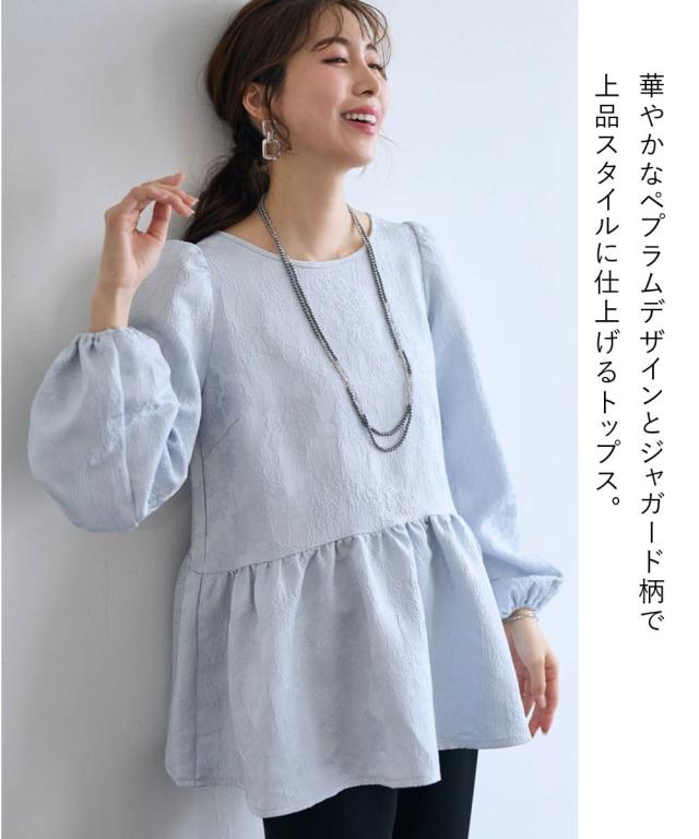 〜 『今』の私を素敵に輝かせてくれるオトナのためのオトナ服 『今』を楽しみ活躍するオトナ世代にお届け トレンドを取り入れたデザインと、素材や着心地にもこだわった、『今』着たいアイテムを取り揃え 〜 女性らしさ薫る、上品なジャガードトップス ■デザイン ・ジャガード柄で、さりげなく顔周りを明るく華やかに彩ります。 ・程よいボリュームのペプラムシルエットが、気になるお腹周りをさりげなくカバーしてくれるのも嬉しいポイント。 ■素材 ・上品な光沢と繊細な凹凸が美しいジャガード素材を使用。ふんわりと優しい印象のジャガード素材が、大人の女性らしさを演出します。 ■おすすめのスタイリング ブラウス感覚で着こなせるので、着回し力も抜群。オフィスシーンにも、お呼ばれにも、幅広いシーンで活躍してくれるアイテムです。