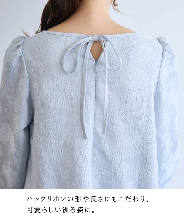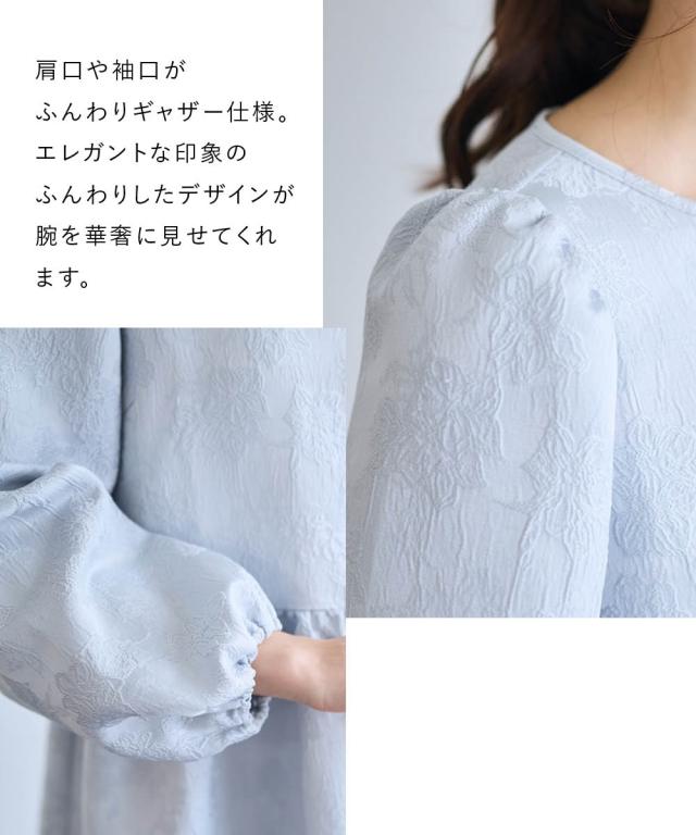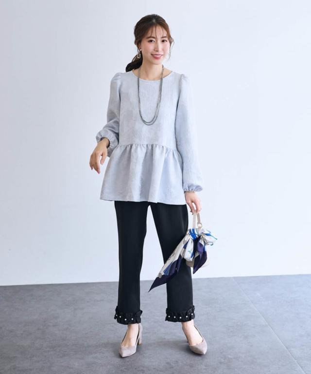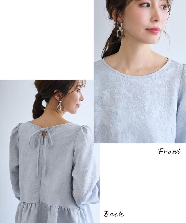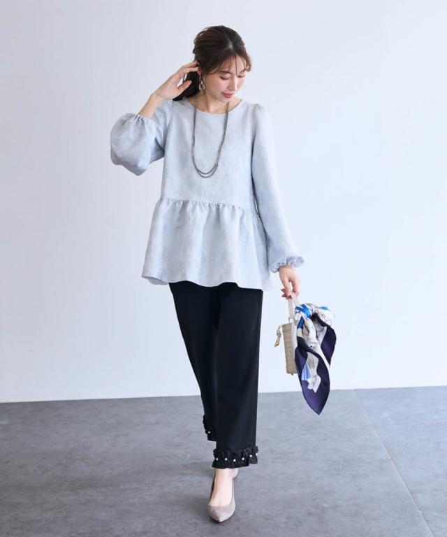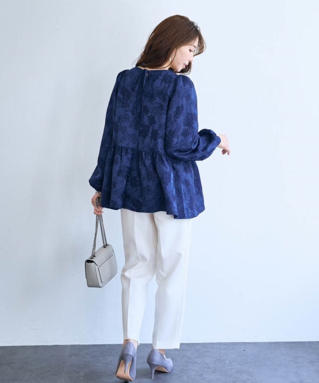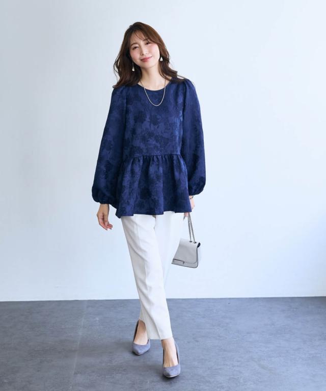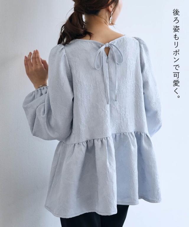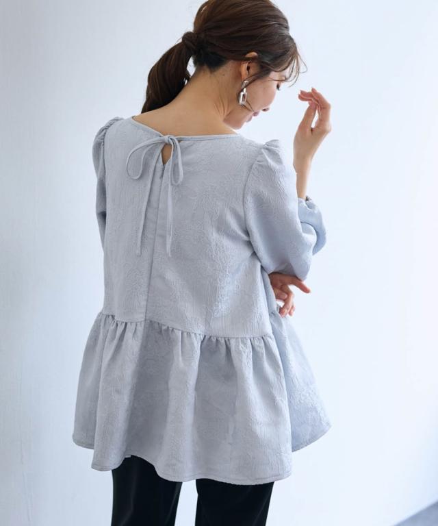 〜 『今』の私を素敵に輝かせてくれるオトナのためのオトナ服 『今』を楽しみ活躍するオトナ世代にお届け トレンドを取り入れたデザインと、素材や着心地にもこだわった、『今』着たいアイテムを取り揃え 〜 女性らしさ薫る、上品なジャガードトップス ■デザイン ・ジャガード柄で、さりげなく顔周りを明るく華やかに彩ります。 ・程よいボリュームのペプラムシルエットが、気になるお腹周りをさりげなくカバーしてくれるのも嬉しいポイント。 ■素材 ・上品な光沢と繊細な凹凸が美しいジャガード素材を使用。ふんわりと優しい印象のジャガード素材が、大人の女性らしさを演出します。 ■おすすめのスタイリング ブラウス感覚で着こなせるので、着回し力も抜群。オフィスシーンにも、お呼ばれにも、幅広いシーンで活躍してくれるアイテムです。
