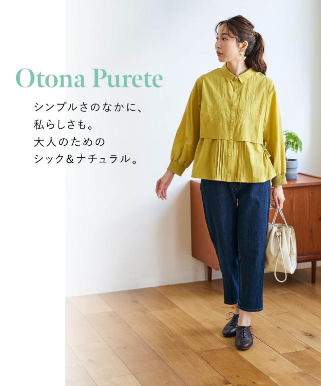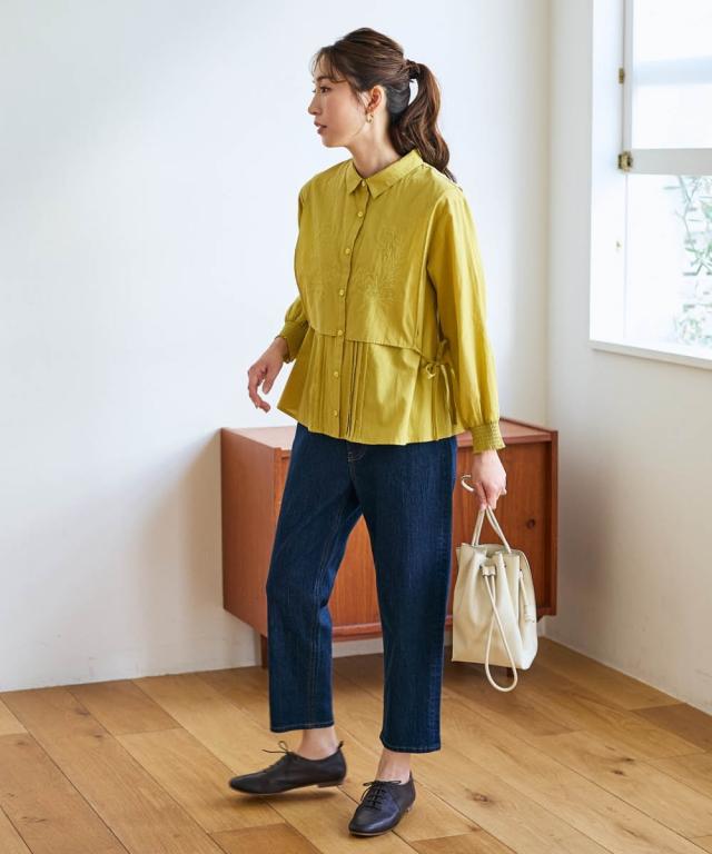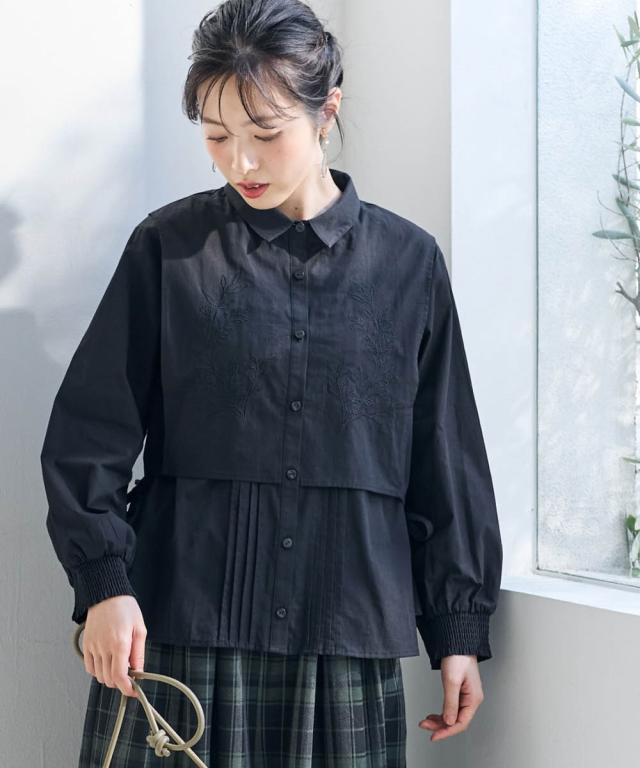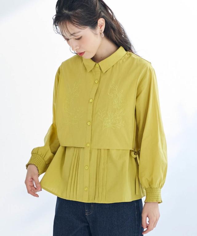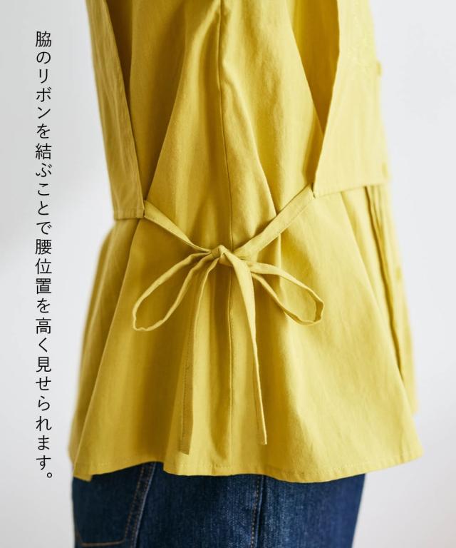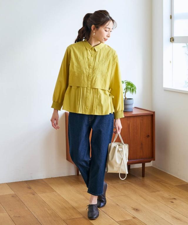 着回し力抜群!フェミニンなレイヤード風ブラウスが新登場! ■デザイン ベストを羽織ったようなレイヤード風デザインは、着るだけでこなれ感を演出できます。ピンタックのデザインと胸元のボタニカル刺しゅうが上品な華やかさとナチュラル感を演出。サイドのリボンを結んでシルエットを調節しても良し、ルーズに垂らしても良し。お袖はプッシュアップもしやすい一部シャーリング仕様。 ■素材 肌触りのよい綿100%生地。 ■おすすめのスタイリング カジュアルなデニムと合わせれば、大人可愛い休日スタイルに。ボリュームのあるスカートと合わせれば、大人可愛いナチュラル&フェミニンスタイルに。着こなし次第で様々な表情を楽しめるブラウスです。 〜 ナチュラル&カジュアル なオトナのデイリーウェア 豊かなライフスタイルと心地の良い毎日を 肌ざわりや着心地の良さはもちろん、シンプルさの中に自分らしさをプラスしたリラックスできるスタイルのご提案 〜