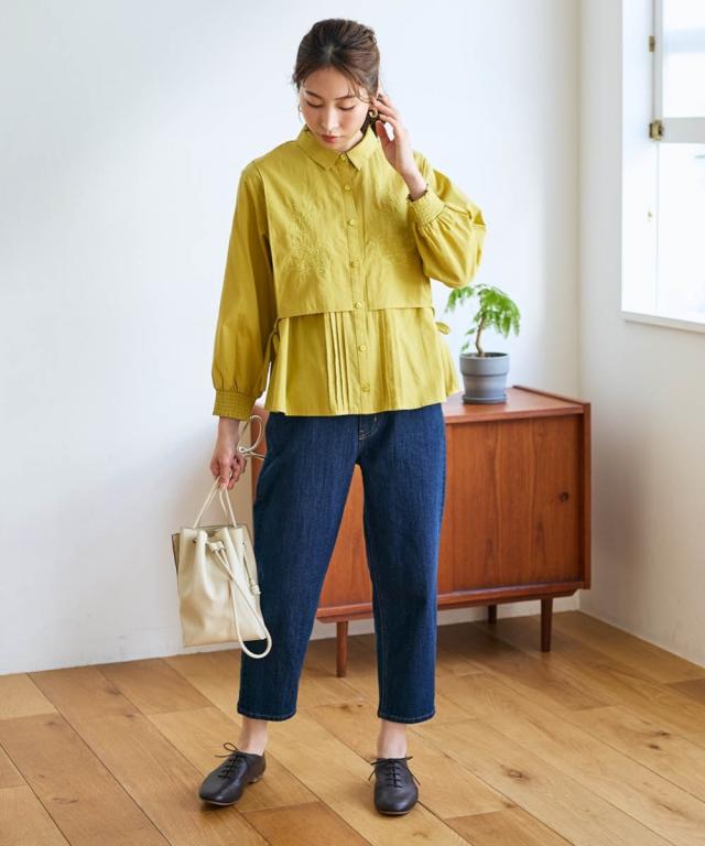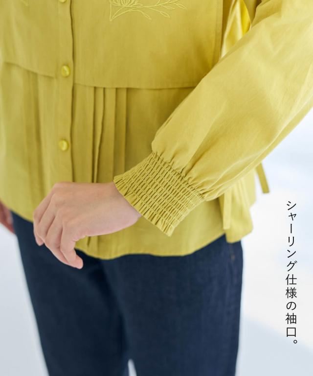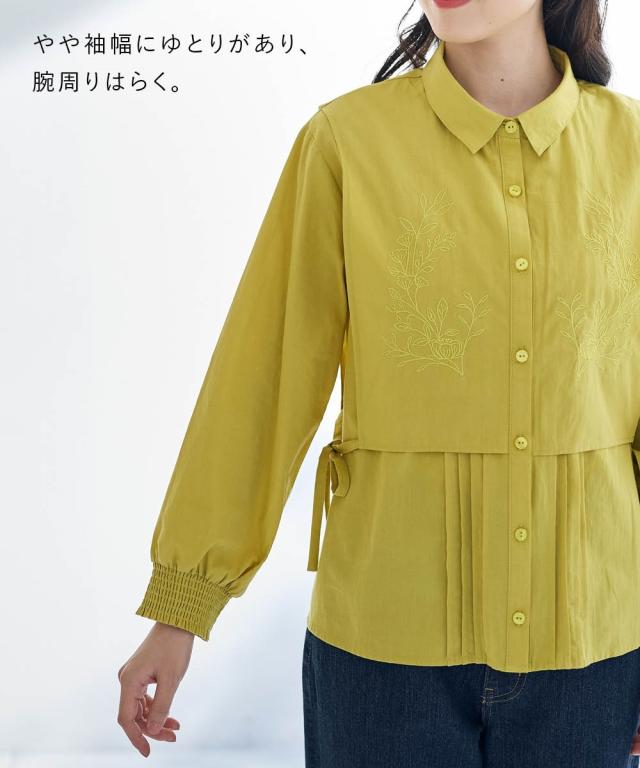 着回し力抜群!フェミニンなレイヤード風ブラウスが新登場! ■デザイン ベストを羽織ったようなレイヤード風デザインは、着るだけでこなれ感を演出できます。ピンタックのデザインと胸元のボタニカル刺しゅうが上品な華やかさとナチュラル感を演出。サイドのリボンを結んでシルエットを調節しても良し、ルーズに垂らしても良し。お袖はプッシュアップもしやすい一部シャーリング仕様。 ■素材 肌触りのよい綿100%生地。 ■おすすめのスタイリング カジュアルなデニムと合わせれば、大人可愛い休日スタイルに。ボリュームのあるスカートと合わせれば、大人可愛いナチュラル&フェミニンスタイルに。着こなし次第で様々な表情を楽しめるブラウスです。 〜 ナチュラル&カジュアル なオトナのデイリーウェア 豊かなライフスタイルと心地の良い毎日を 肌ざわりや着心地の良さはもちろん、シンプルさの中に自分らしさをプラスしたリラックスできるスタイルのご提案 〜