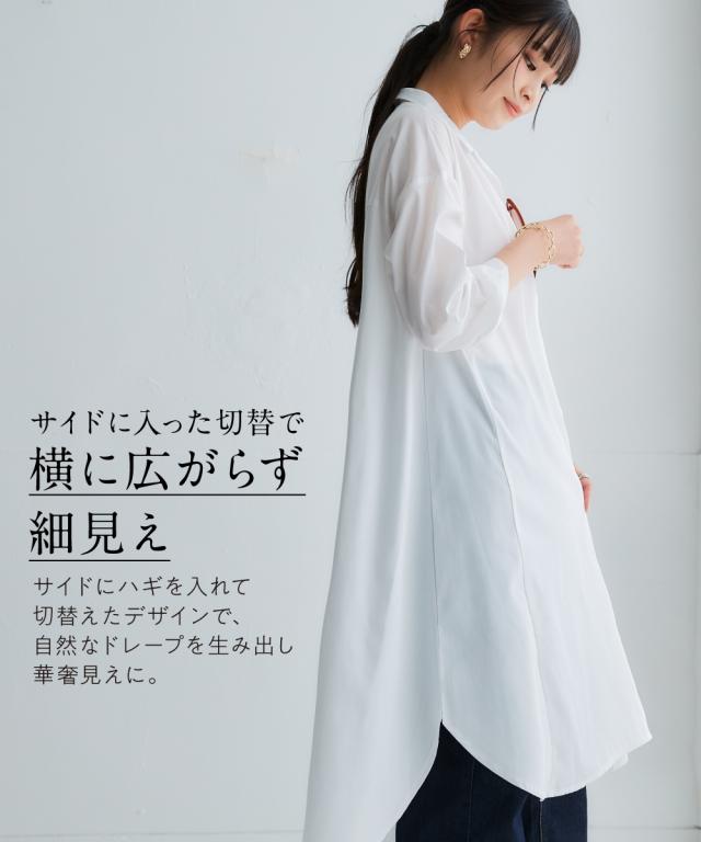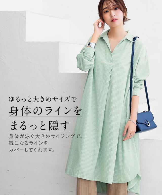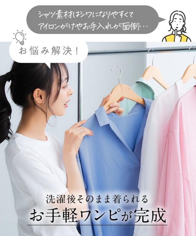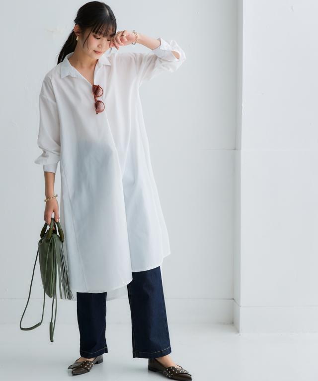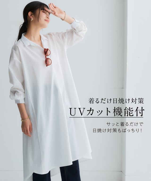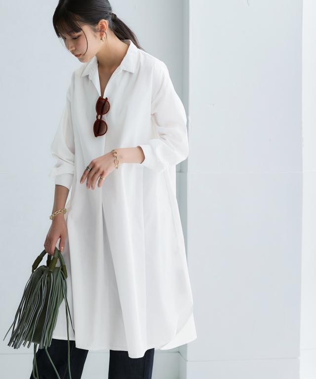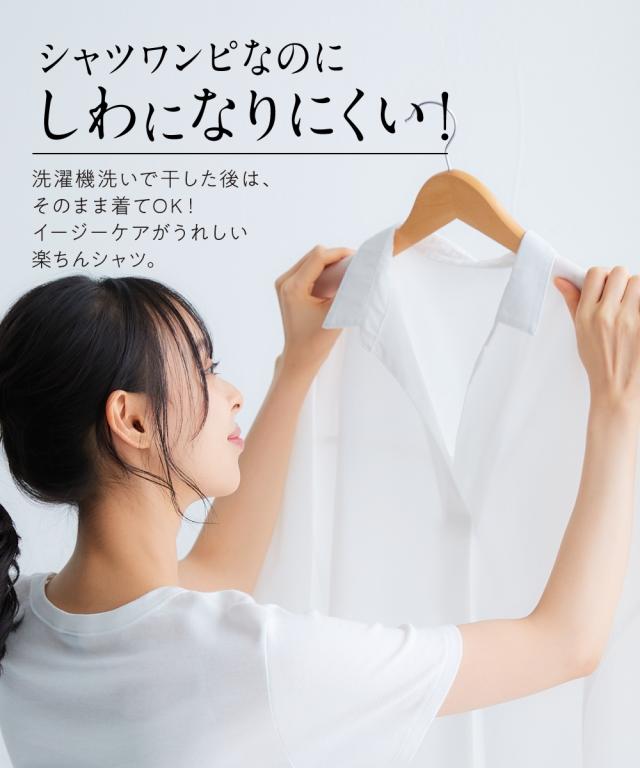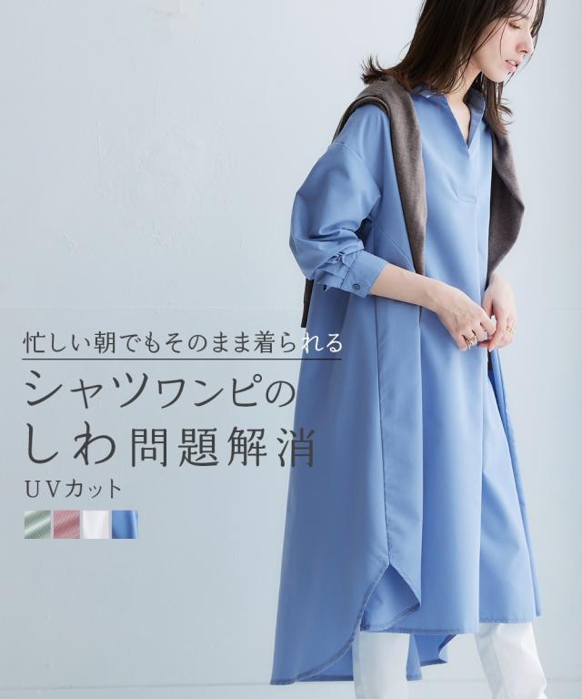 お手入れ簡単 身体のラインを拾わずまるっと隠すシャツワンピ■デザイン ゆったり身幅で体型カバー。身幅が大きい服にありがちな大きく見える問題は、サイドにハギを入れて切り替えているからたっぷり生地を使っているのに自然なドレープ感が出て美しいシルエットにすることで解消。体型カバーしながら抜け感もプラスできる万能ワンピースです。■素材 シャツワンピースなのにしわになりにくい!アイロンかけたくないというお声からお手入れ簡単な素材にこだわりました。UVカット機能もついているので日焼け対策にも。身体になじみつつ適度なハリ感もあるから抜き衿スタイルが決まる!自然な立体感が出てこなれた雰囲気に■おすすめのスタイリング ボトムとのレイヤードスタイルが決まる絶妙な丈感。肌寒い時はニットをインに着るなどレイヤードスタイルにもオススメです