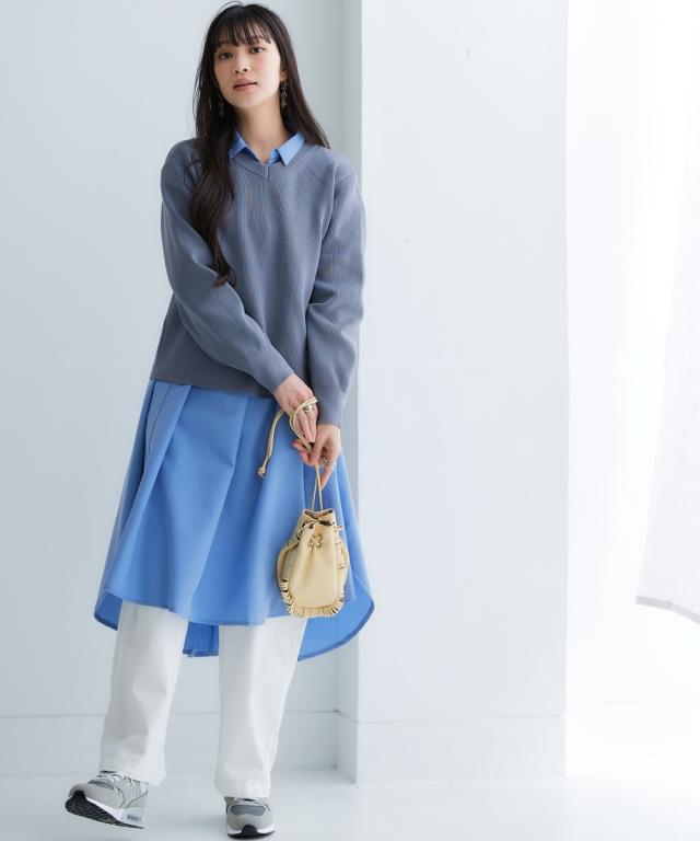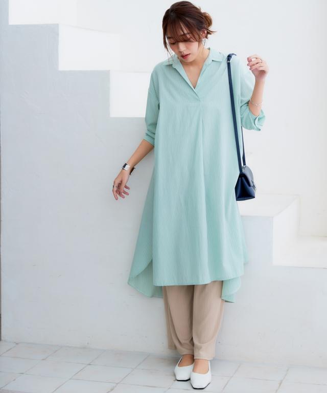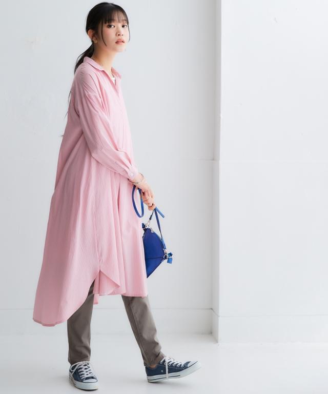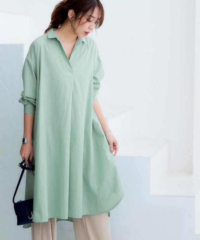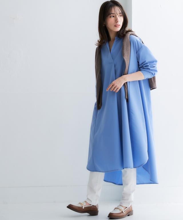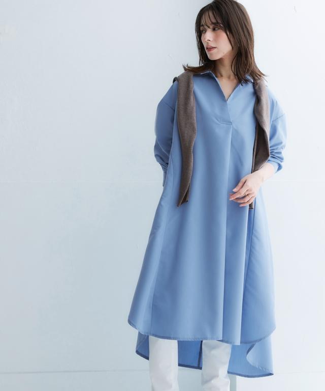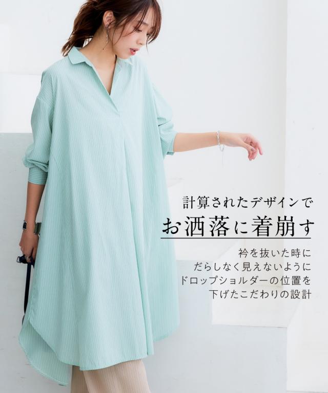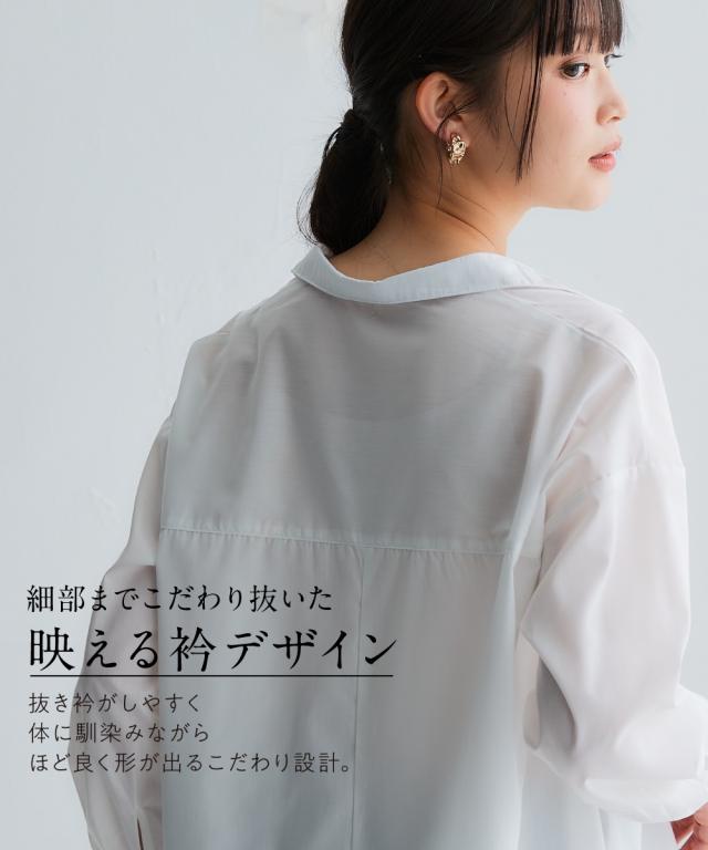 お手入れ簡単 身体のラインを拾わずまるっと隠すシャツワンピ■デザイン ゆったり身幅で体型カバー。身幅が大きい服にありがちな大きく見える問題は、サイドにハギを入れて切り替えているからたっぷり生地を使っているのに自然なドレープ感が出て美しいシルエットにすることで解消。体型カバーしながら抜け感もプラスできる万能ワンピースです。■素材 シャツワンピースなのにしわになりにくい!アイロンかけたくないというお声からお手入れ簡単な素材にこだわりました。UVカット機能もついているので日焼け対策にも。身体になじみつつ適度なハリ感もあるから抜き衿スタイルが決まる!自然な立体感が出てこなれた雰囲気に■おすすめのスタイリング ボトムとのレイヤードスタイルが決まる絶妙な丈感。肌寒い時はニットをインに着るなどレイヤードスタイルにもオススメです