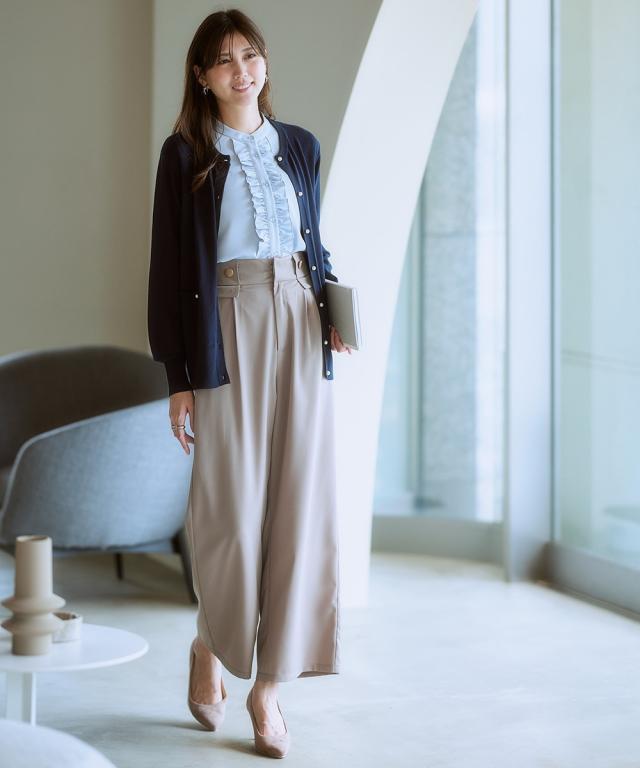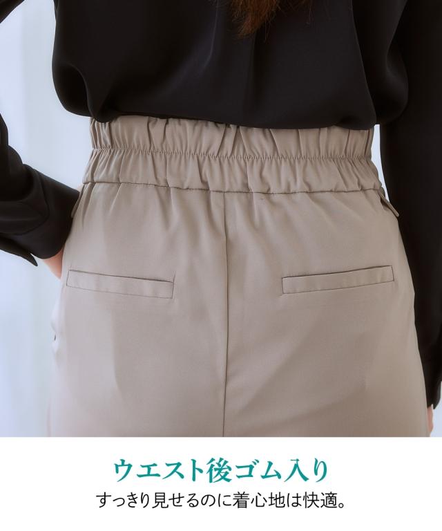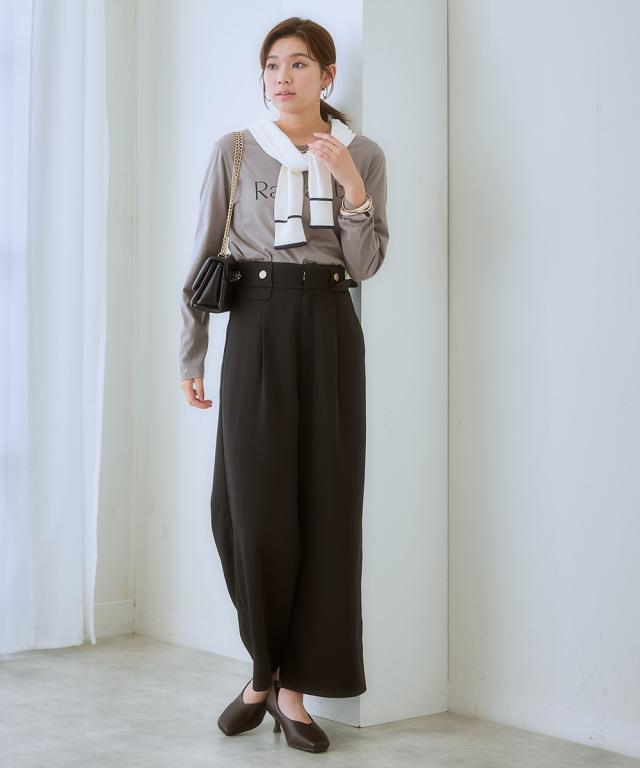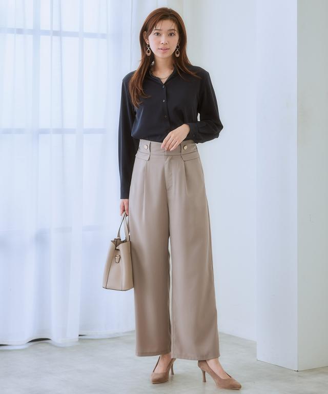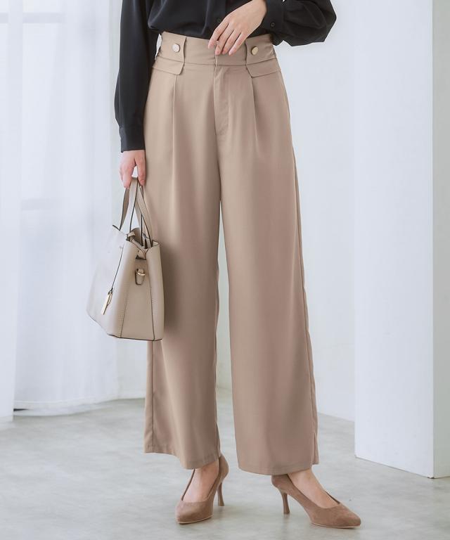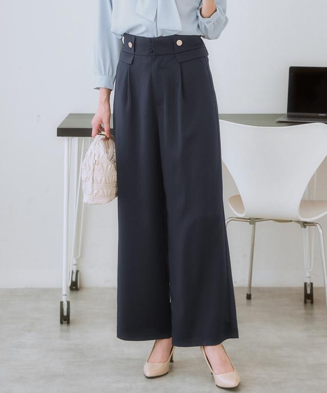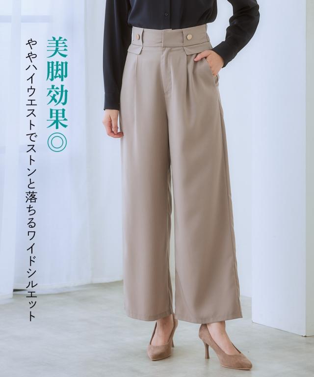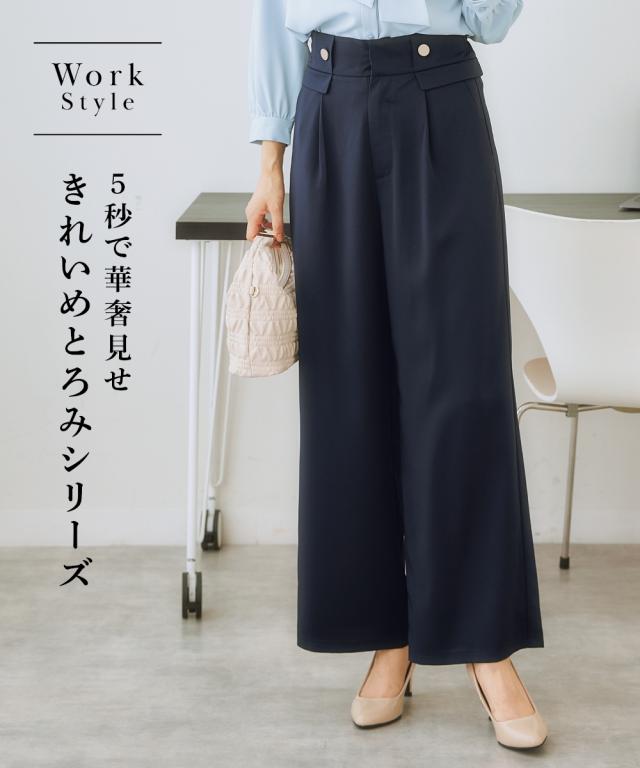 【ウエストまわりのデザインがかわいい】リッチな金ボタンやフラップでコーデに変化が付く1本。すっきりきれい見えを叶えるシルエット。■ポイント ・落ち感のあるとろみ素材を使っているので、身体のラインを拾いにくく華奢見え効果あり。 ・楽ちんときれいを叶える、お仕事コーデに必須のすっきりワイドパンツ。■デザイン ・ややハイウエストですとんと落ちる脚きれい見えなワイドシルエット。 ・コーディネートを格上げするフロントのが高見え金ボタン。 ・ウエストは後ろゴム入りなので、すっきり見えるのに着心地は快適。■素材 ・控えめな光沢感ととろみ感のあるきれい見え素材。 ・すっきり見せが叶うほどよい落ち感あり。 ・ヨコストレッチで動きやすくシワになりにくい高見え素材。■おすすめのスタイリング ・シンプルなTシャツやデザインブラウスなど、フロントインして使うのがおすすめ。〜7days Life Styling〜 仕事の日、休日、イベントの日まで、 働く女性の毎日を商品やコンテンツを通して、 自分らしく快適でいられる“働く服改革”をサポートします。