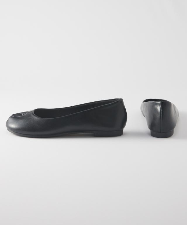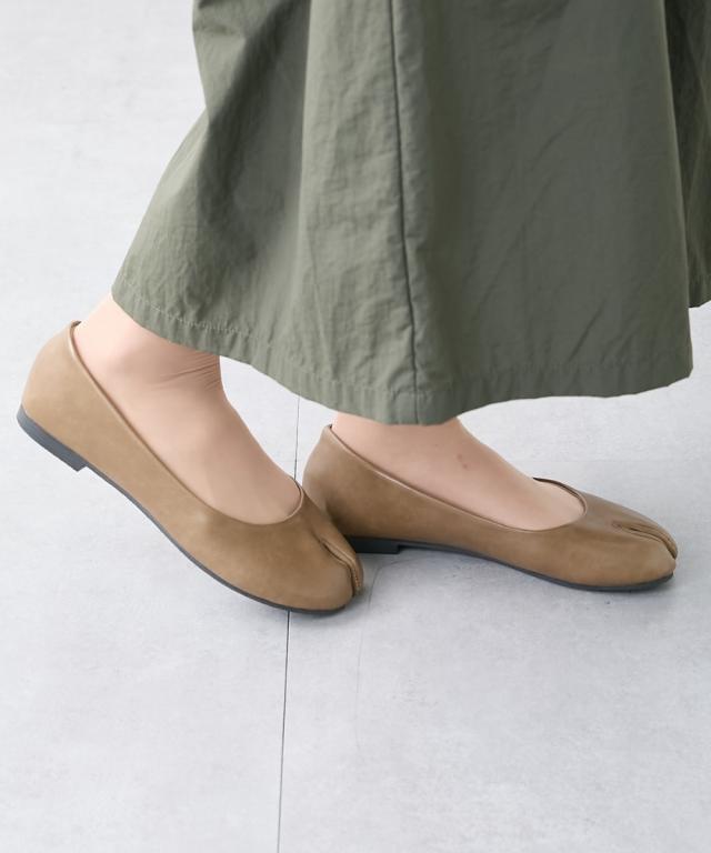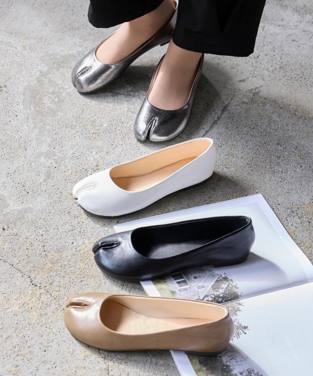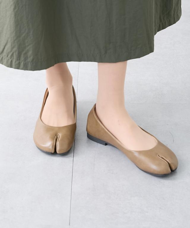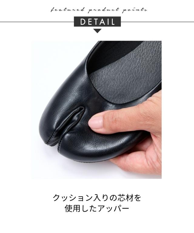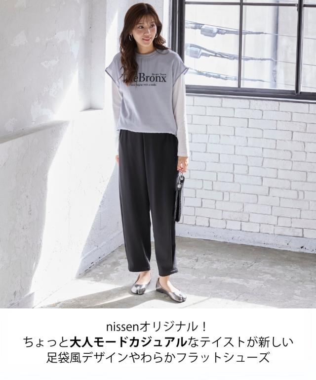 nissenオリジナル!足袋風デザインやわらかフラットシューズ。ちょっと大人モードカジュアルなテイストが新しい。モードっぽいデザインなので、素材は色々なお洋服に合わせやすい合皮使いにしました。■ポイント ・モード・大人・ストリート・色々な「カジュアル」コーデがおすすめ! ・足袋ソックス×足袋風デザインパンプスで靴下合わせも ・通常フラットパンプスに使用される低反発中敷きより厚みを持たせ、足裏のあたりを優しくしました。 ・底だけでなく、表のアッパー材はやわらかい合皮を使用し、裏側のライニングはクッション制のあるメッシュ地でとにかくやわらか。 ・足袋ソックスやフットカバー合わせでもご着用いただきやすいよう、ワイズは3E設定に。