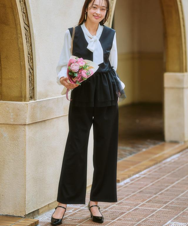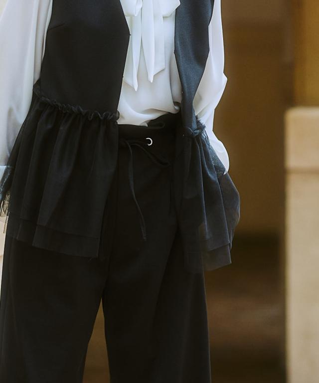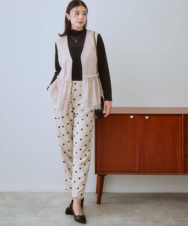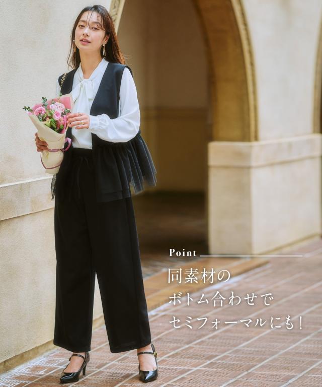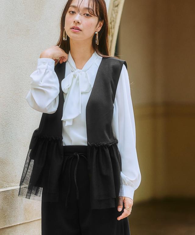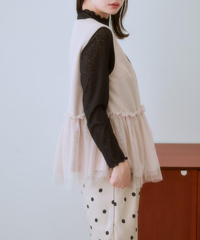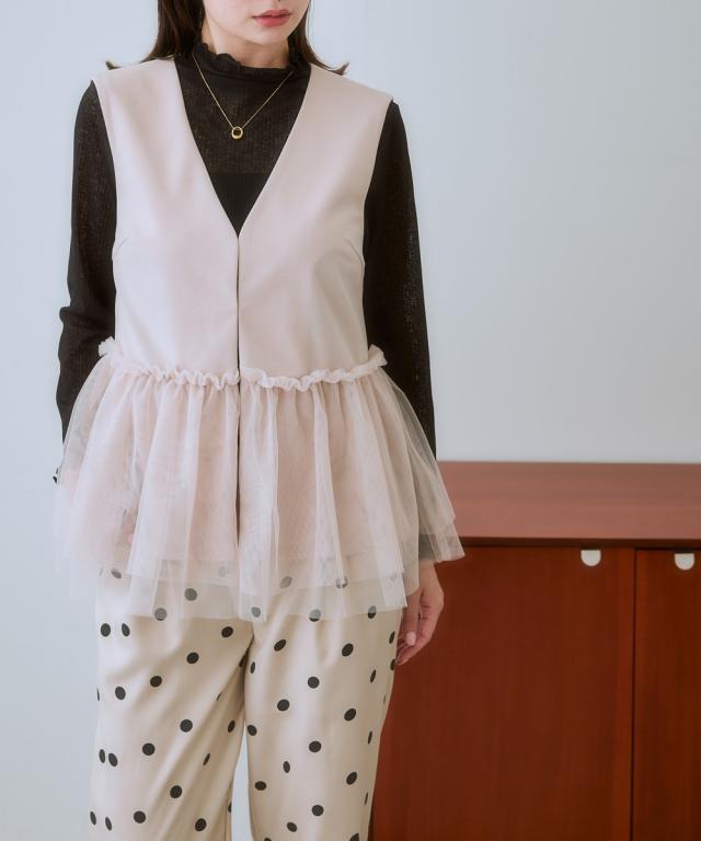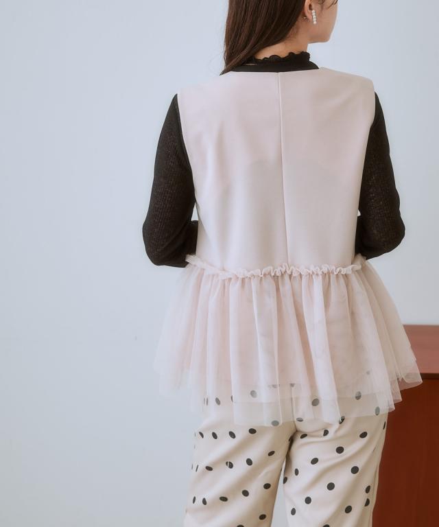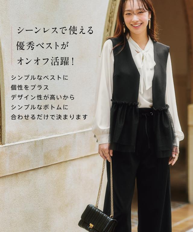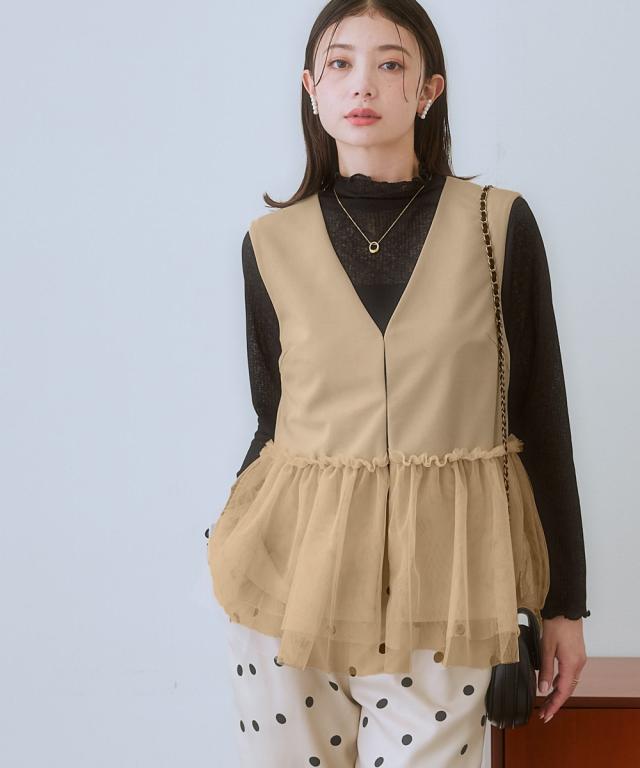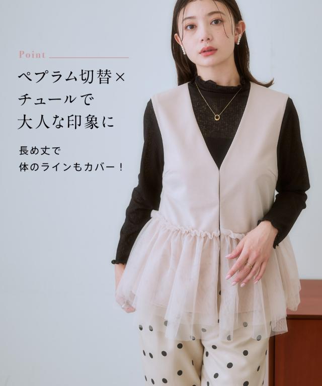 〜上品なチュール使いで、いつものコーデを格上げしてくれるベスト〜 ■デザイン 可愛らしさと大人っぽさを兼ね備えたレース使いのベストが登場しました。 ブラックはどんなコーデにも合わせやすく、上品な印象に。 ライトベージュは、優しいカラーで、女性らしい雰囲気に。 チュール素材が、軽やかで華やかな印象を与え、コーデのアクセントに。 前ホック開きなので、着脱も簡単です。 ■素材 動きやすくよく伸びる素材を採用! ベストだからあまりゆるゆるに着るのもバランス悪いのでジャストサイズで選んでもこの生地ならラクラクです! ■おすすめのスタイリング ワンピースやブラウスの上にも羽織れるので、着回し力も抜群です。 デイリー使いはもちろん、オフィスやパーティーにもおすすめです。