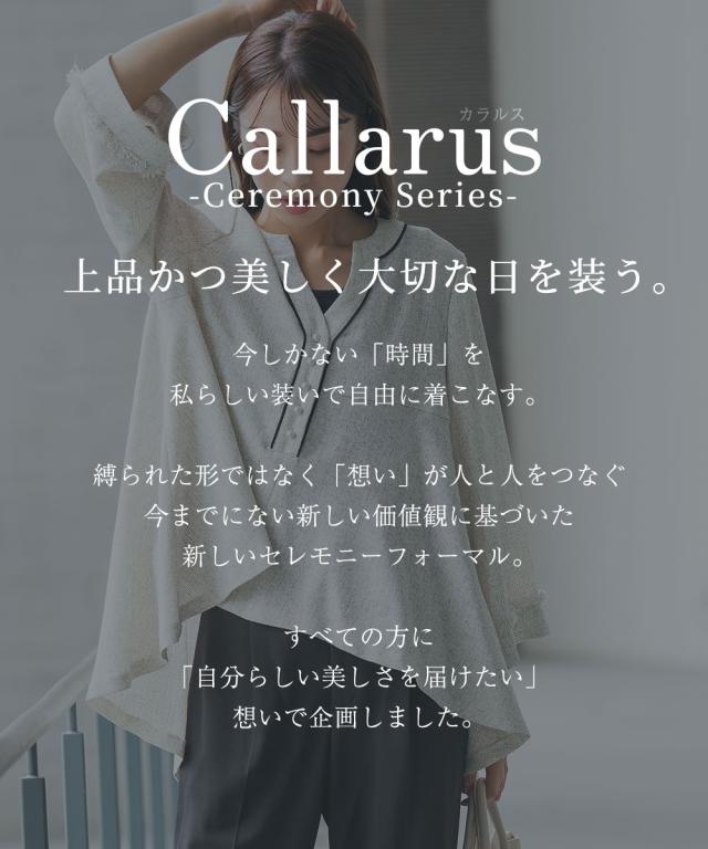 【Callarus(カラルス)】〜for Ceremony Formal〜まっすぐブレない美しさで人々を魅了する花“calla lily”とラテン語で輝くという意味の“clarus”を合わせた造語がブランド名の由来です。<自分らしく上品で美しい装いを大切にする方へ> 縛られたカタチではなく、「想い」が人と人をつなぐ シーンにもテイストにも年齢にも縛られない自由な着こなしを実現する新しいセレモニーフォーマル こだわりポイント エレガンスな装いでクールなママを表現それぞれ着回しできる使いやすいパンツセットアップ 表面感のあるドビー生地を使用したデザインブラウス パール調ボタンを使いことで、可愛い雰囲気に 袖口にフリンジ加工をすることで、こなれた装いに キーネック仕様で、程よい抜け感を演出 スタイリングなパンツスーツスタイル パンツには伸縮性にある生地を使用洗濯機で洗えるのでお手入れ簡単!忙しいママに嬉しい着やすさとお手入れしやすさを兼ね備えています セレモニーシーンだけでなく、通勤・結婚式・参観日・七五三・普段使いなど、 幅広いシーンに対応できるパンツセットアップです。 体型カバーポイント 綺麗なシルエットで体型カバーしつつ、上