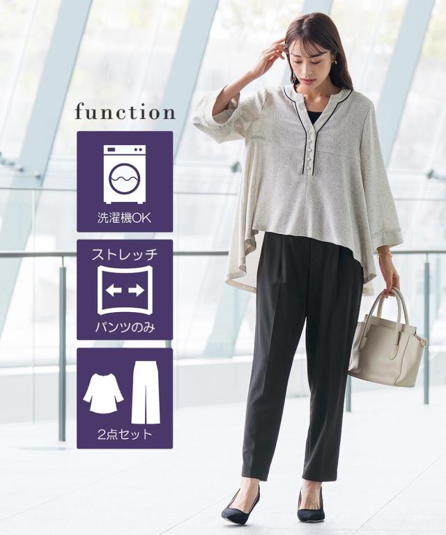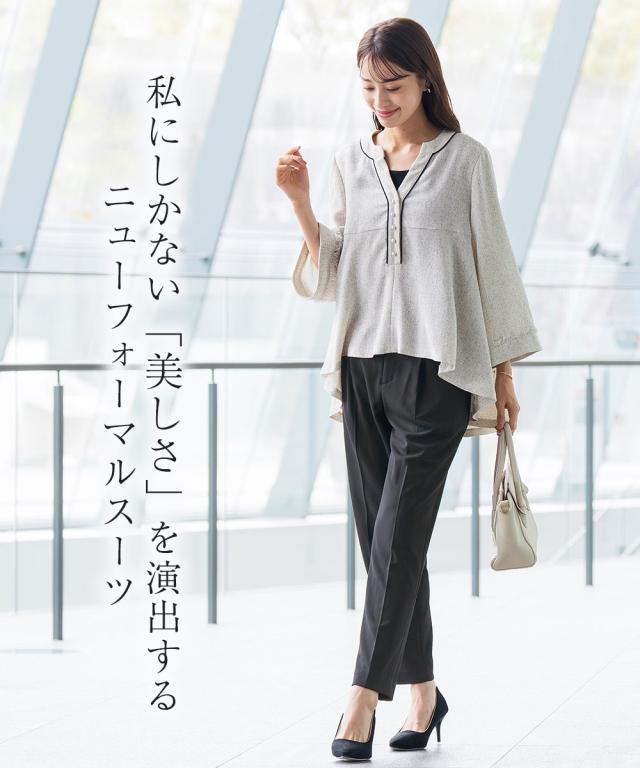スーツ パンツ フォーマル レディース 入学式 卒業式 パール調ボタン使いドビーキーネック ブラウス +テーパード セッアップ 有 〔Callarus〕 ニッセン nissen