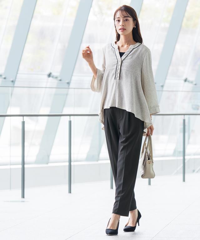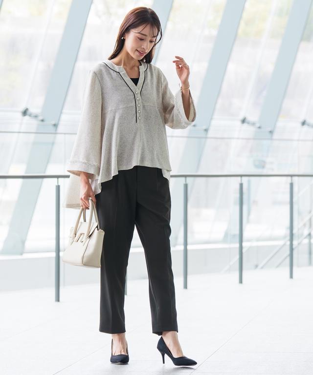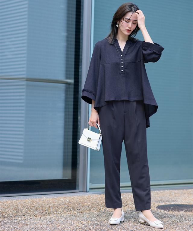 【入学式・卒業式・フォーマル】パール調ボタン使いドビーキーネックブラウス+テーパードパンツセッアップ 〔Callarus〕