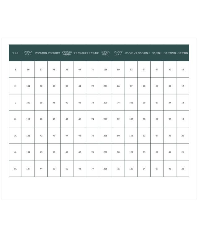 ブラウス:前ボタン開 パンツ:前ファスナー内ホック開 ウエスト後ゴム入 ポケット両脇