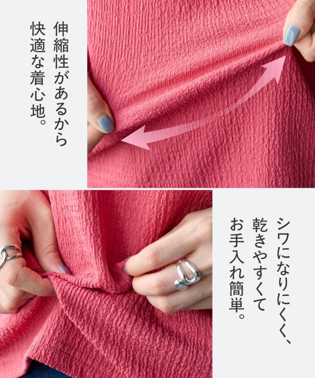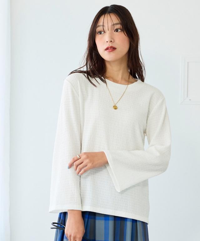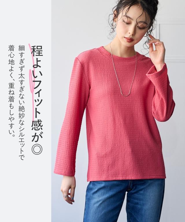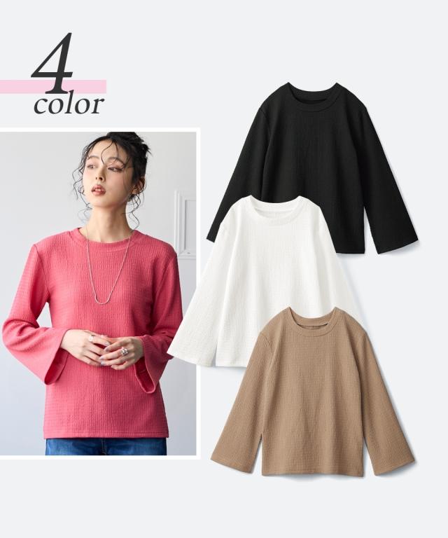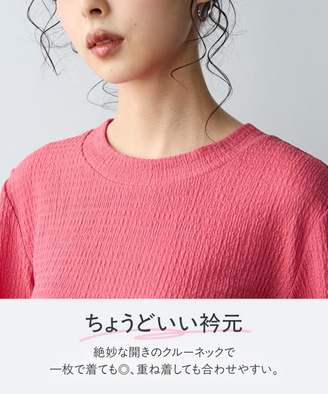 凹凸感のあるポコポコ素材が体型をひろいにくくスッキリ見せてくれます。1枚でも重ね着でもつかえる優秀トップス! ■デザイン シンプルなクルーネックで着回しやすい1枚。袖がフレア袖になっているので今っぽく重ね着のポイントに。袖先がもたつかないように9分丈にしています。 ■素材 凹凸感のあるポコポコした素材で体型をひろいにくい。ポリエステルなので乾きやすくしわになりにくいので毎日の洗濯に便利です。 ■おすすめのスタイリング 体型をひろいにくいので1枚で着てもOK。ジャンスカやベストとの重ね着にも スッキリしたシルエットなのでフレアシルエットのスカートやワイドパンツとも相性良し。着回しのきく便利な1枚です