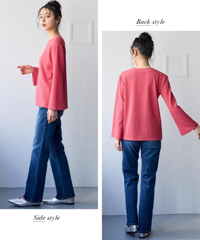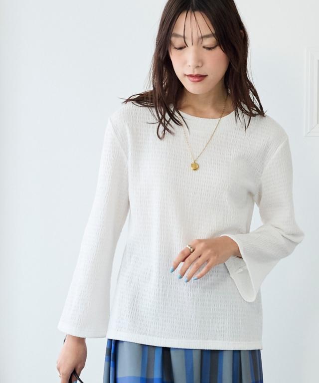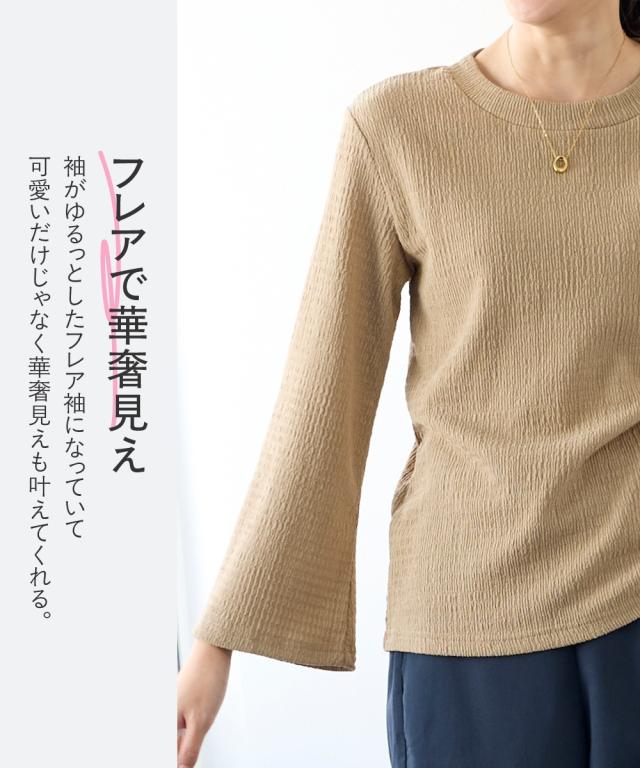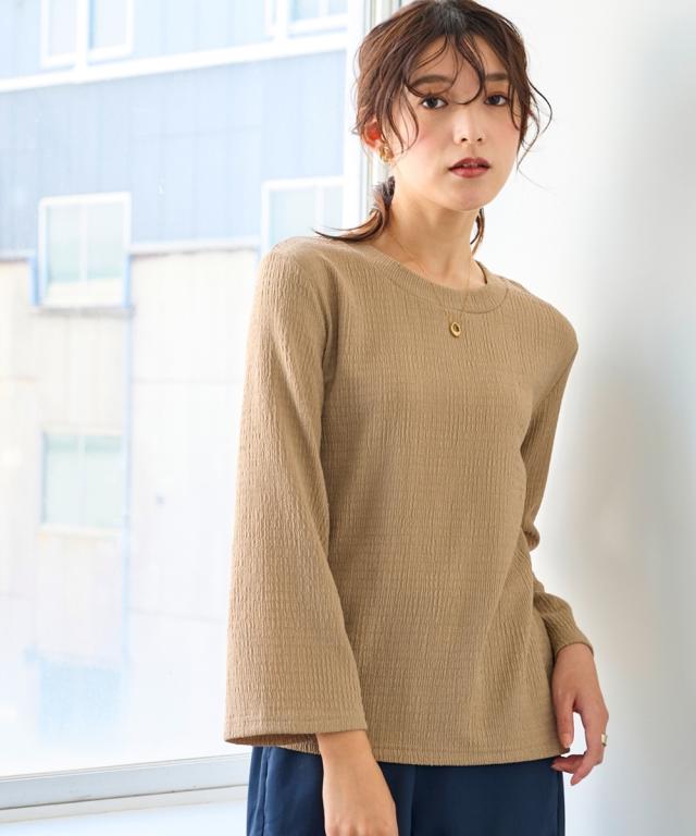 凹凸感のあるポコポコ素材が体型をひろいにくくスッキリ見せてくれます。1枚でも重ね着でもつかえる優秀トップス! ■デザイン シンプルなクルーネックで着回しやすい1枚。袖がフレア袖になっているので今っぽく重ね着のポイントに。袖先がもたつかないように9分丈にしています。 ■素材 凹凸感のあるポコポコした素材で体型をひろいにくい。ポリエステルなので乾きやすくしわになりにくいので毎日の洗濯に便利です。 ■おすすめのスタイリング 体型をひろいにくいので1枚で着てもOK。ジャンスカやベストとの重ね着にも スッキリしたシルエットなのでフレアシルエットのスカートやワイドパンツとも相性良し。着回しのきく便利な1枚です