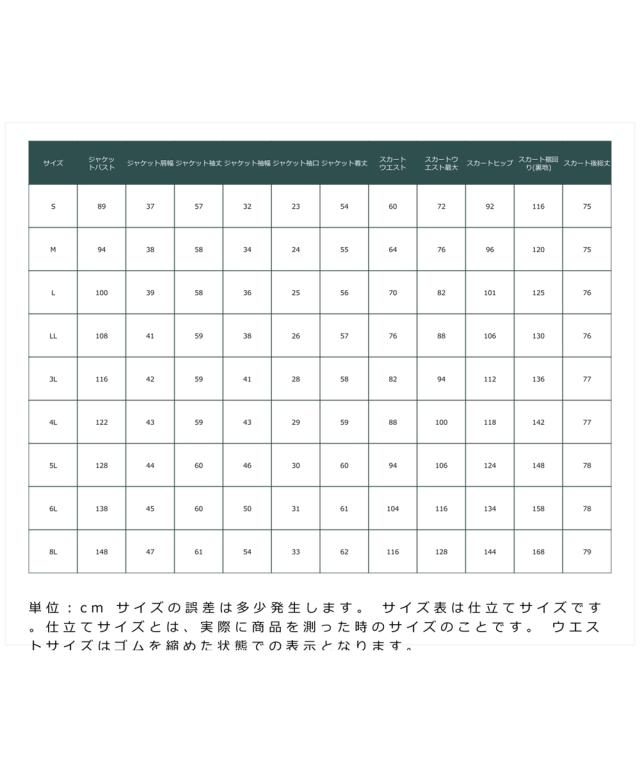 品質=[表地]ポリエステル65%・レーヨン30%・ポリウレタン5% [裏地]有(ジャケット:背抜き スカート:総裏)ジャケット:肩パッド有(取外し不可) 前ホック開 ポケット前2・左内 袖口スリットスカート:後ホック付ファスナー開 ウエスト後ゴム入 ポケット両脇 両脇スリット※ジャケットはLLサイズから五面体仕様です。※この商品は2点同サイズでのみ販売します。 原産国:中国製 備考:洗濯機OK ネット使用 ※単位:cm ※サイズの誤差は多少発生します。 ※サイズ表は仕立てサイズです。仕立てサイズとは、実際に商品を測った時のサイズのことです。 ※ウエストサイズはゴムを縮めた状態での表示となります。