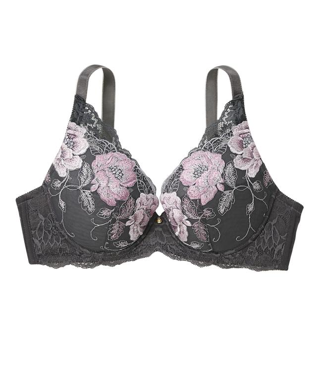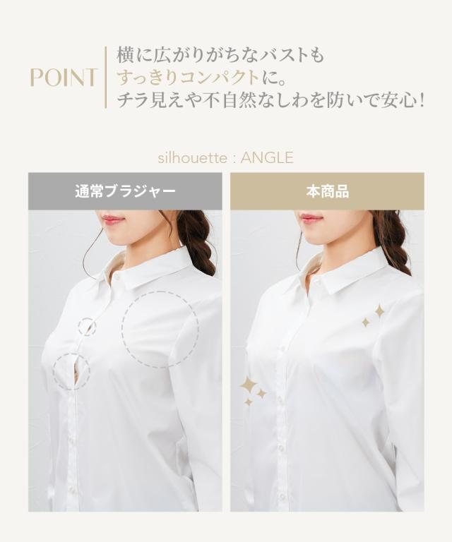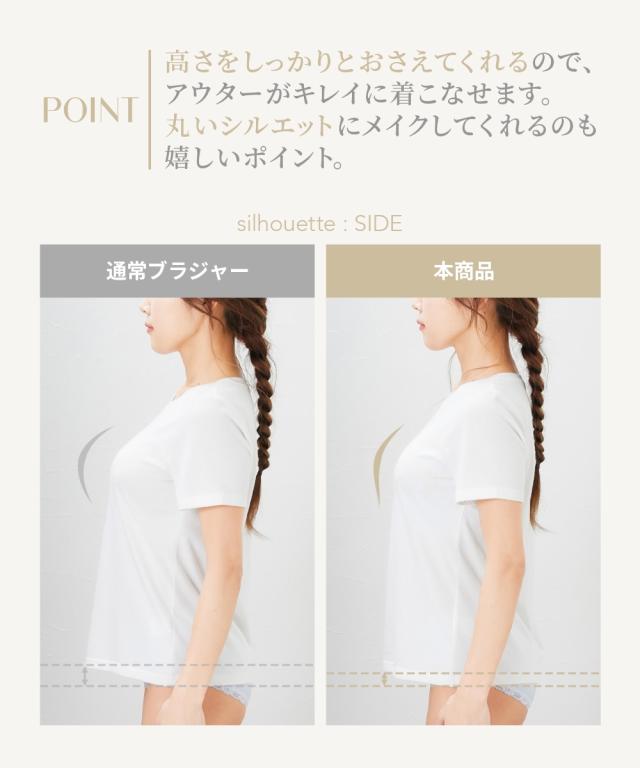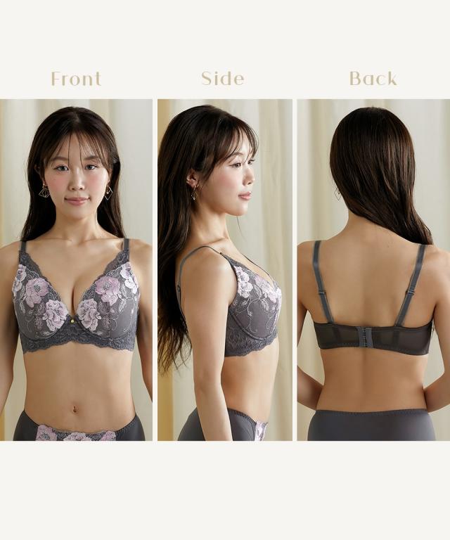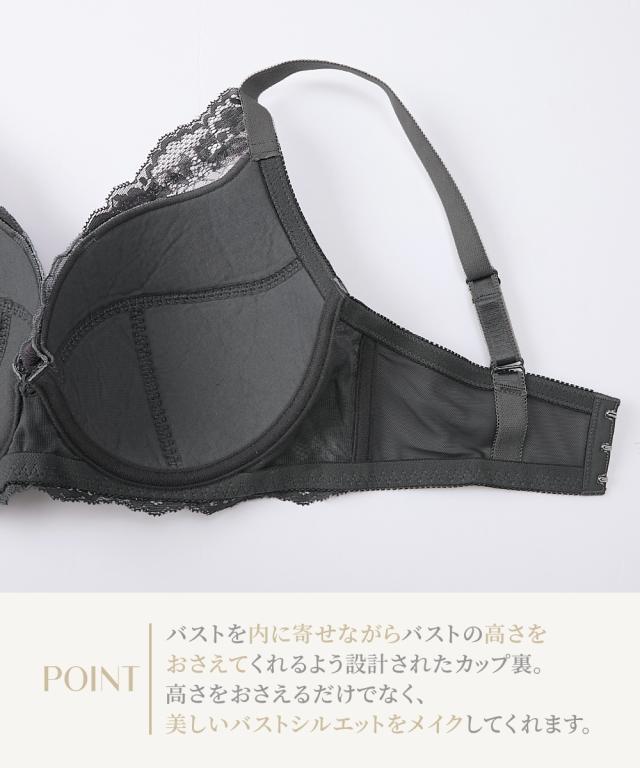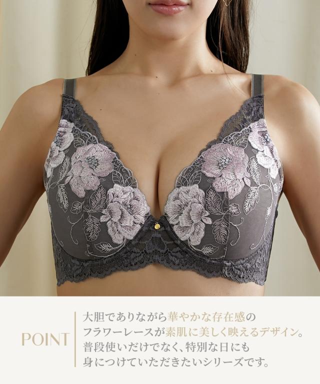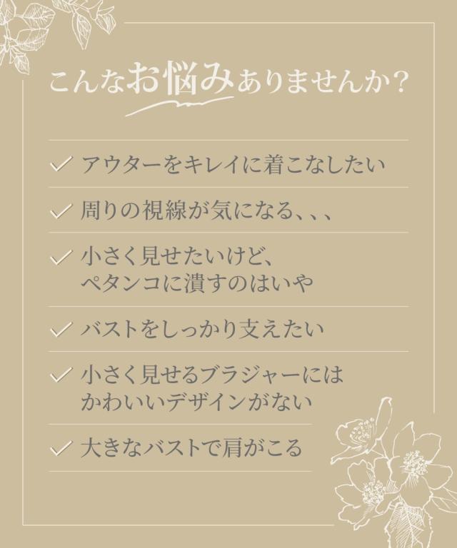 高さを出さずに丸いシルエットをメイクする小さく見せるブラジャー。 大胆でありながら華やかな存在感のフラワーレースが素肌に美しく映えるデザイン。 普段使いだけでなく、特別な日にも身につけていただきたいシリーズです。 カップはバストを内に寄せながらバストの高さをおさえてくれるよう設計されているので美しいバストシルエットをメイクしてくれます。 お揃いのコーディネートショーツを合わせればトータルコーディネートをお楽しみいただけます。 こんな方におすすめ! ・アウターをキレイに着こなしたい ・周りの視線が気になる、、、 ・小さく見せたいけど、ペタンコに潰すのはいや ・バストをしっかり支えたい ・小さく見せるブラジャーにはかわいいデザインがない ・大きなバストで肩がこる