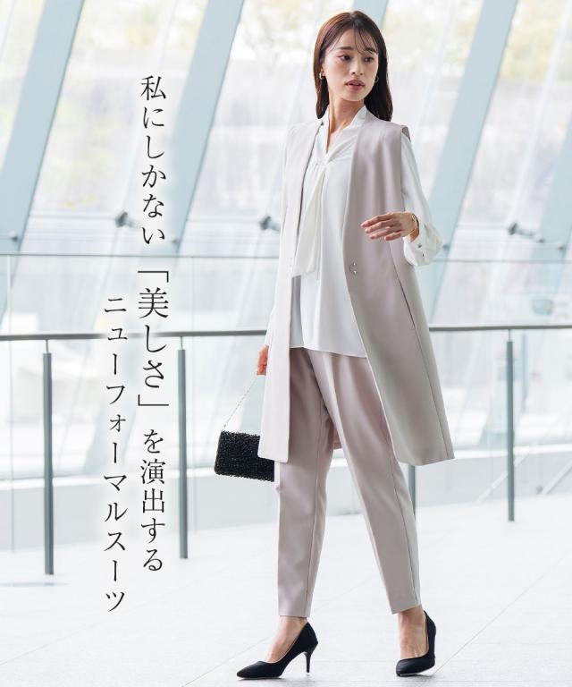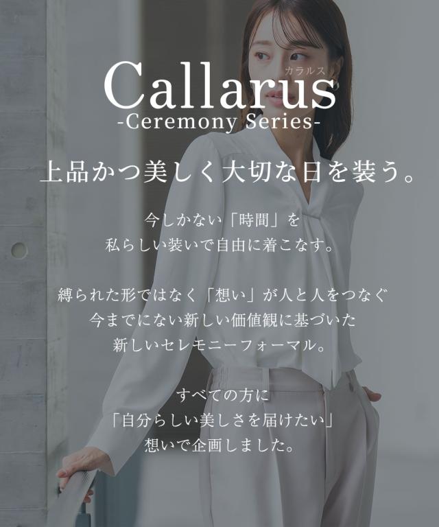 【Callarus(カラルス)】 〜for Ceremony Formal〜 まっすぐブレない美しさで人々を魅了する花“calla lily”と ラテン語で輝くという意味の“clarus”を合わせた造語がブランド名の由来です。 <自分らしく上品で美しい装いを大切にする方へ> 縛られたカタチではなく、「想い」が人と人をつなぐ シーンにもテイストにも年齢にも縛られない自由な着こなしを実現する新しいセレモニーフォーマル。 こだわりポイント エレガンスな装いでクールなママを表現 それぞれ着回しできる使いやすい3点セットスーツ 抜け感のあるロング丈ノーカラージレ 立体感を演出してくれるタックボウタイ風デザインブラウス スタイリッシュなシルエットのテーパードパンツ ストレッチ生地を使用し、着用時の窮屈さを軽減 セレモニーシーンだけでなく、通勤・結婚式・参観日・七五三・普段使いなど幅広いシーンに対応できる3点セットスーツです。 体型カバーポイント 綺麗なシルエットで体型カバーしつつ、上品な印象に格上げしてくれます 気になる二の腕をしっかりカバー! パンツウエスト後ろゴム入りで着心地 ロング丈ジレで、ヒップ周りをしっかりカバー 小物収容で