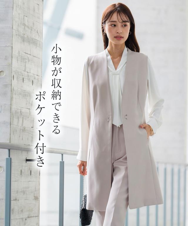 【入学式・卒業式・フォーマル】ロングジレストレッチテーパードパンツ3点セットスーツ(ロング丈ジレ+ボウタイデザインブラウス+パンツ) 〔Callarus〕