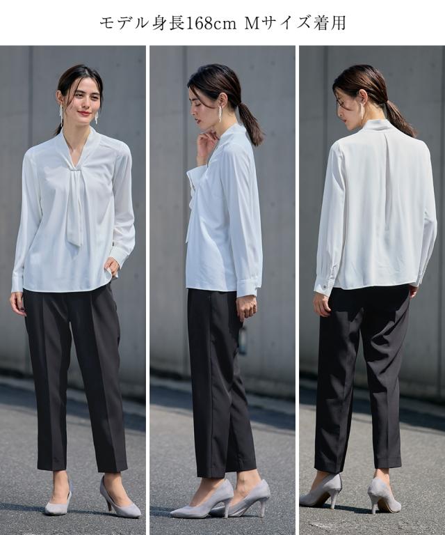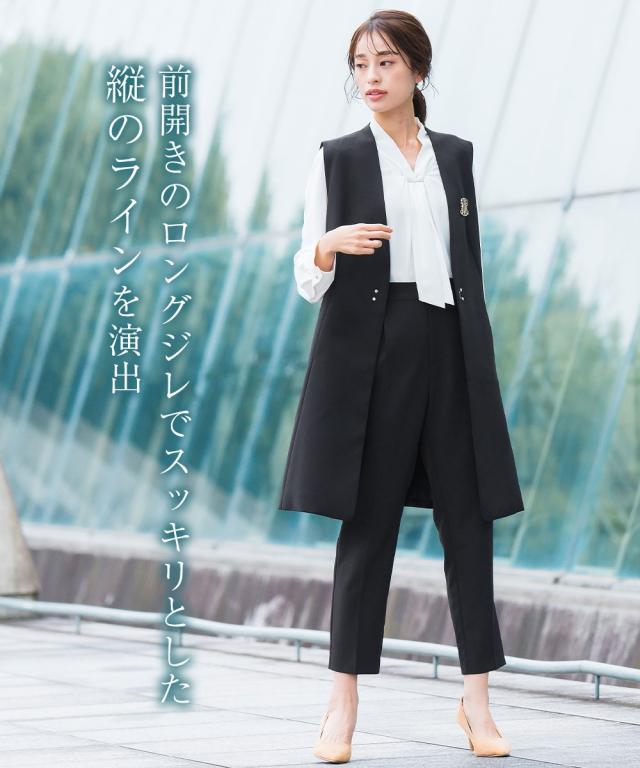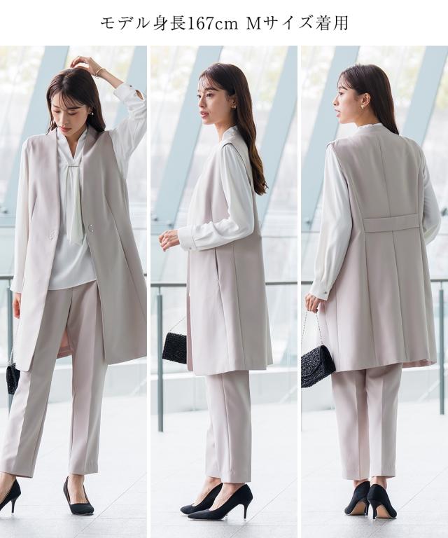 スーツ パンツ フォーマル レディース 入学式 卒業式 ロング ジレ ストレッチ テーパード 3点セット ロング丈ジレ+ボウタイ デザイン ブラウス + 有 〔Callarus〕