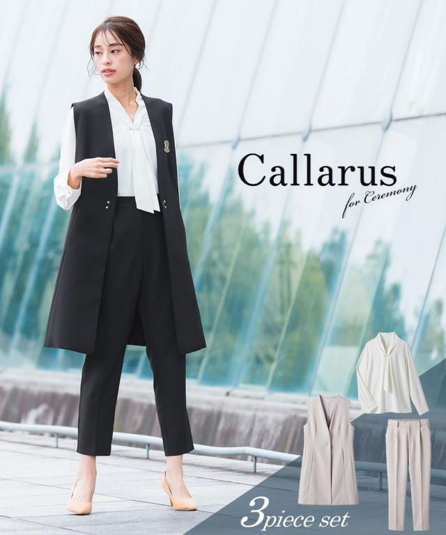 【Callarus(カラルス)】 〜for Ceremony Formal〜 まっすぐブレない美しさで人々を魅了する花“calla lily”と ラテン語で輝くという意味の“clarus”を合わせた造語がブランド名の由来です。 <自分らしく上品で美しい装いを大切にする方へ> 縛られたカタチではなく、「想い」が人と人をつなぐ シーンにもテイストにも年齢にも縛られない自由な着こなしを実現する新しいセレモニーフォーマル。 こだわりポイント エレガンスな装いでクールなママを表現 それぞれ着回しできる使いやすい3点セットスーツ 抜け感のあるロング丈ノーカラージレ 立体感を演出してくれるタックボウタイ風デザインブラウス スタイリッシュなシルエットのテーパードパンツ ストレッチ生地を使用し、着用時の窮屈さを軽減 セレモニーシーンだけでなく、通勤・結婚式・参観日・七五三・普段使いなど幅広いシーンに対応できる3点セットスーツです。 体型カバーポイント 綺麗なシルエットで体型カバーしつつ、上品な印象に格上げしてくれます 気になる二の腕をしっかりカバー! パンツウエスト後ろゴム入りで着心地 ロング丈ジレで、ヒップ周りをしっかりカバー 小物収容で