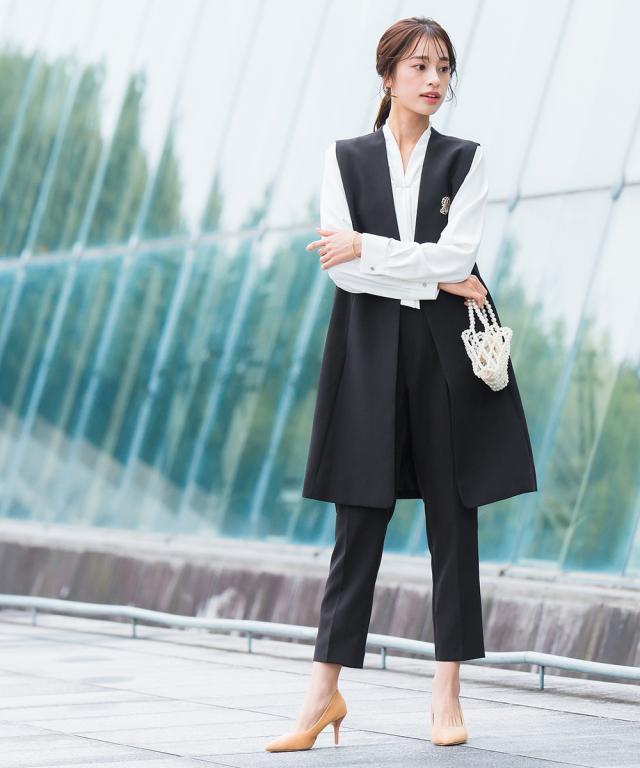【入学式・卒業式・フォーマル】ロングジレストレッチテーパードパンツ3点セットスーツ(ロング丈ジレ+ボウタイデザインブラウス+パンツ) 〔Callarus〕