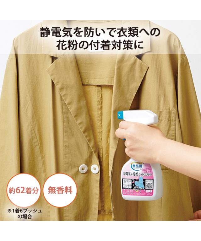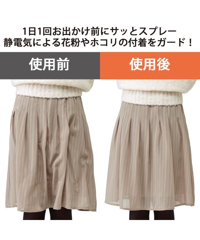 お出かけ前にひと吹き。静電気のパチパチ対策スプレー。 静電気を防いで花粉やホコリの付着をガード。 スカートのまとわりつきや、セーターやニット、車のシートにも。 ホコリや花粉の付着が気になる場合は、衣類の表側に吹きかけてください。 衣類が軽く湿る程度にスプレー ※色落ちやシミが気になるものは、使用前に目立たない部分で確かめてご使用ください。 1日1回、お出かけ前にスプレーするのがおすすめです。 ※使用できないもの 絹、レーヨン、皮革製品など水に弱いもの、水洗いやドライクリーニングができないもの 無香料