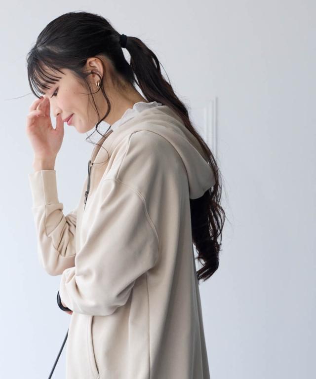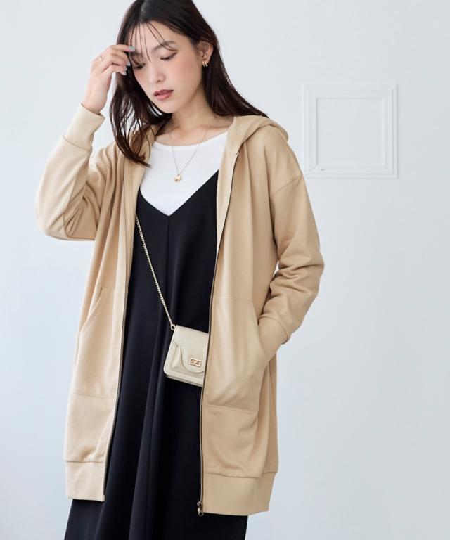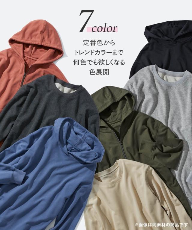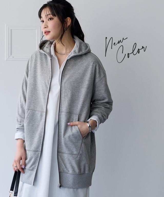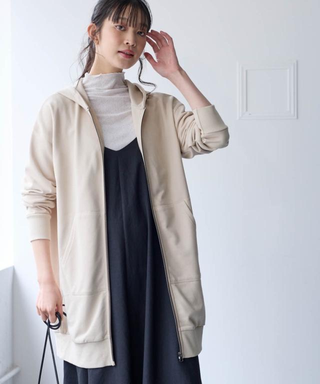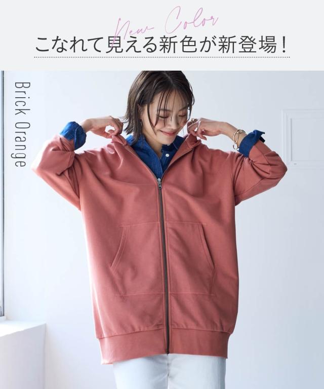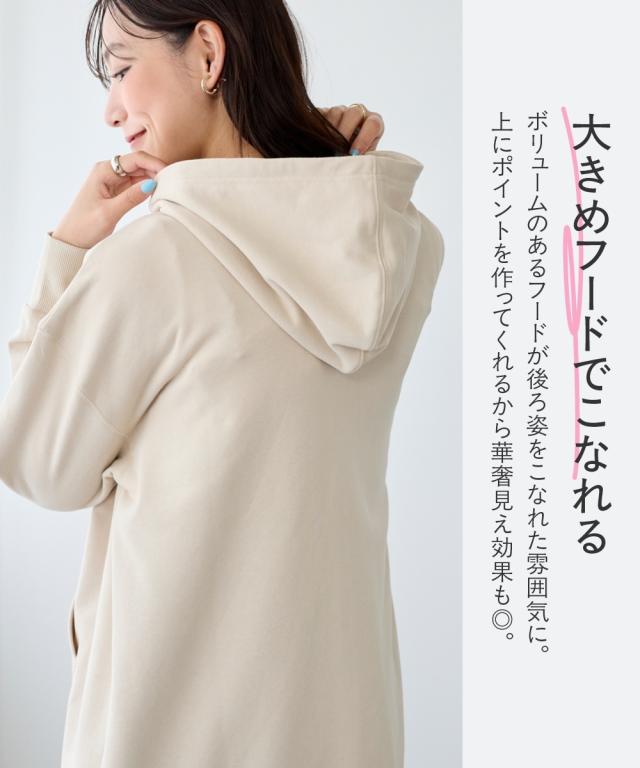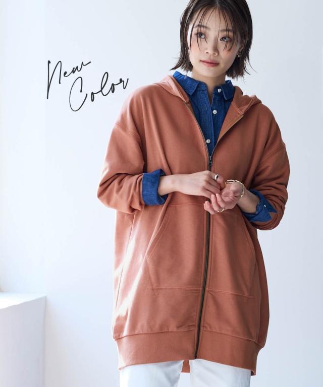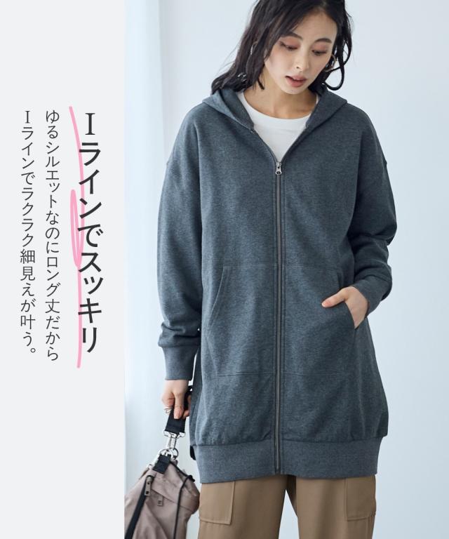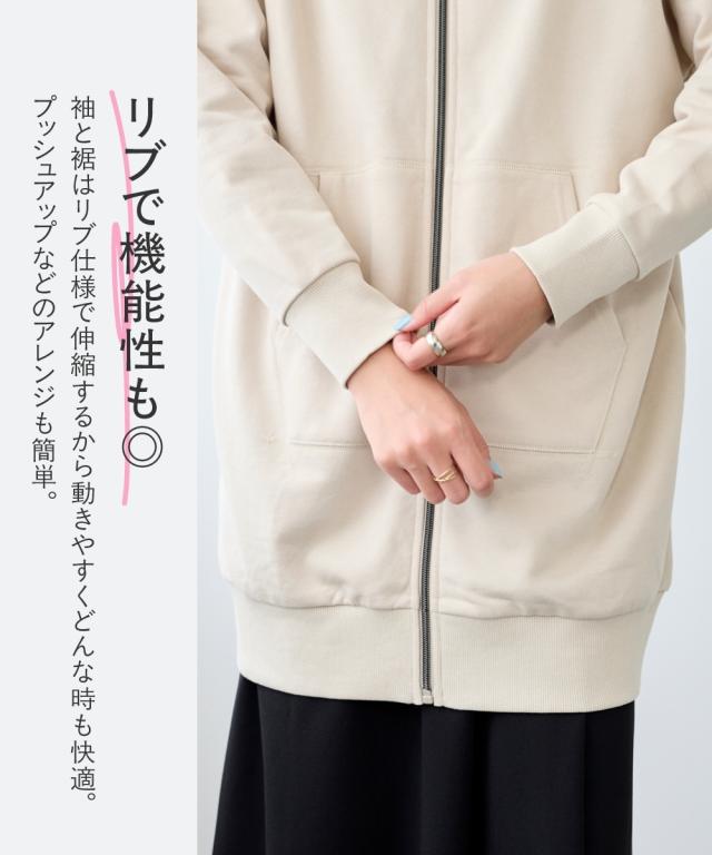 綿100%の優しい肌触り。ゆるっと楽な着心地で気になるところをしっかり隠してくれるロング丈パーカー。 ■デザイン シンプルなデザインで飽きがこず長く使えます。すこしゆるいシルエットなので着ていて楽です。袖周りとバストがゆったりしているので重ね着してもかさばらず窮屈感ゼロ。便利なポケット付き。 ■素材 厚すぎないスェット素材で夏以外、使えます。肌触りの良い安心の綿100%素材です。柔軟加工しているのでチクチクガサガサしにくく柔らか。 ■おすすめのスタイリング 長すぎない丈なので細身のパンツと合わせても可愛いですし、フレアボトムやロングスカートやワイドパンツとも相よくかわいいです。ニットからTシャツまでゆったりしたシルエットのものまで幅広く重ねてももたつかずスッキリ着用できます。