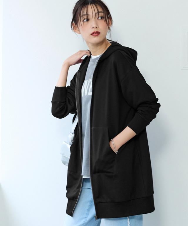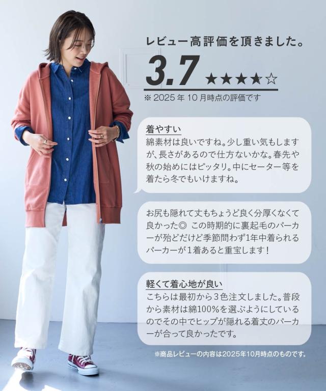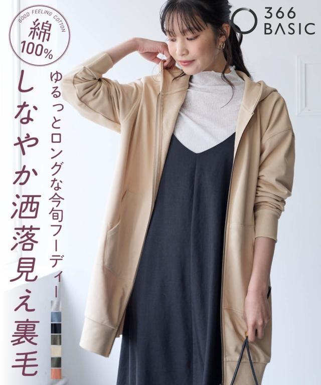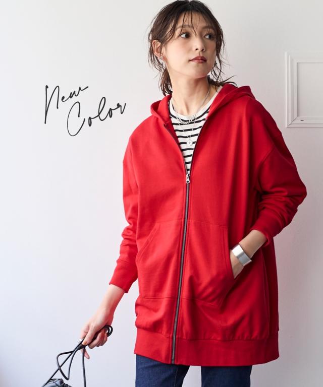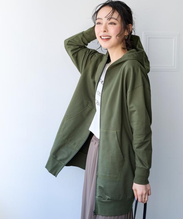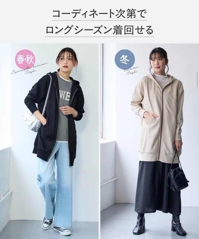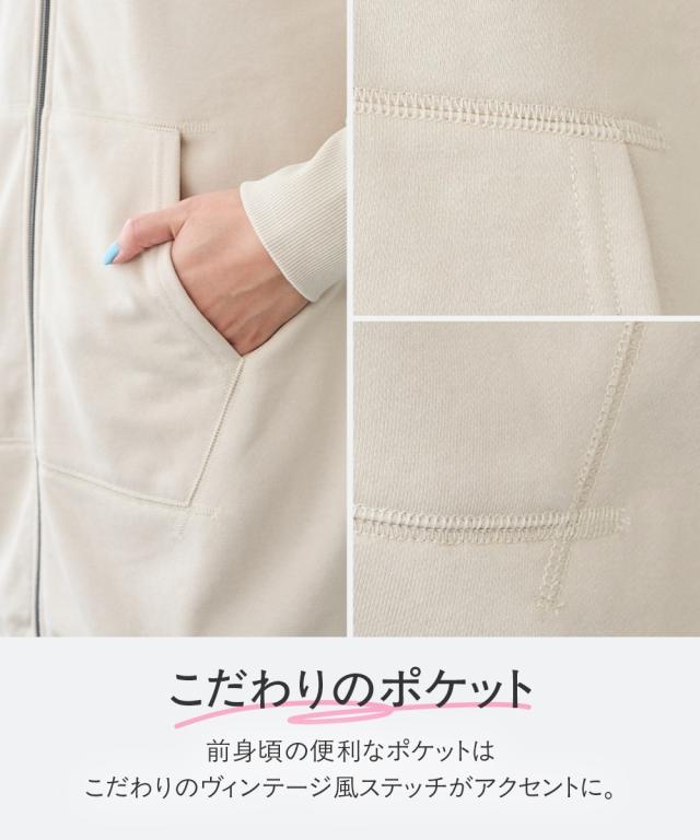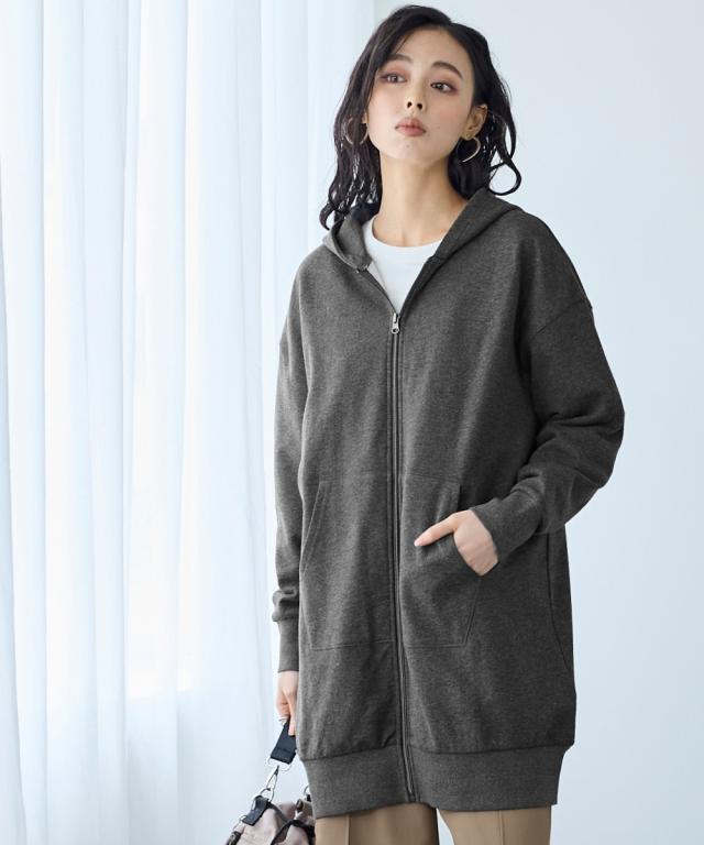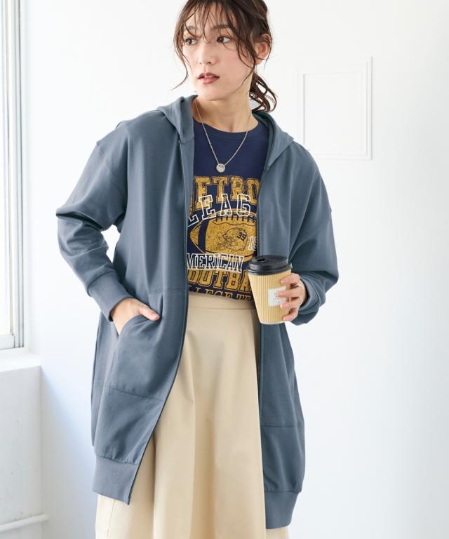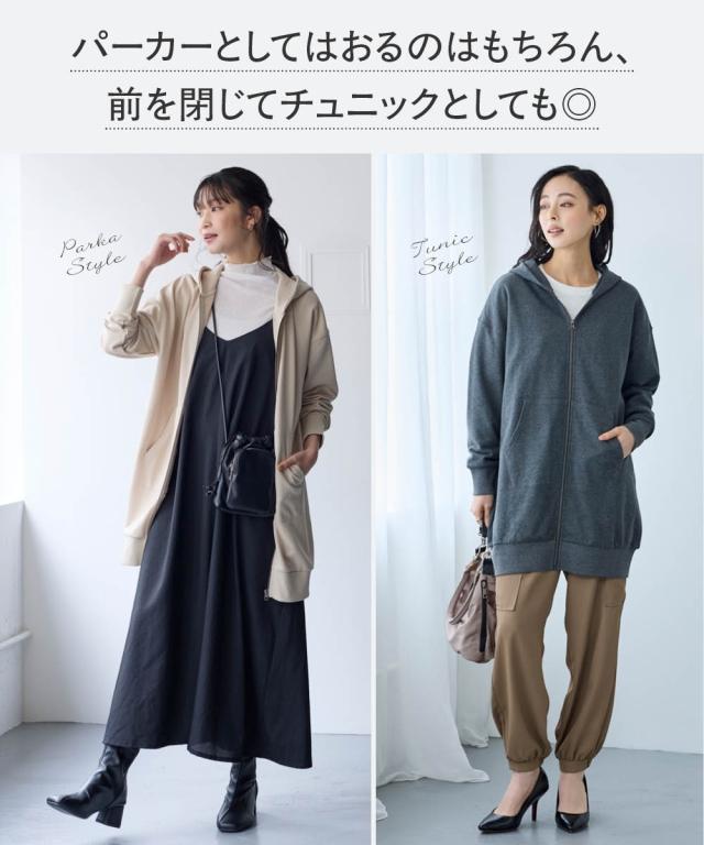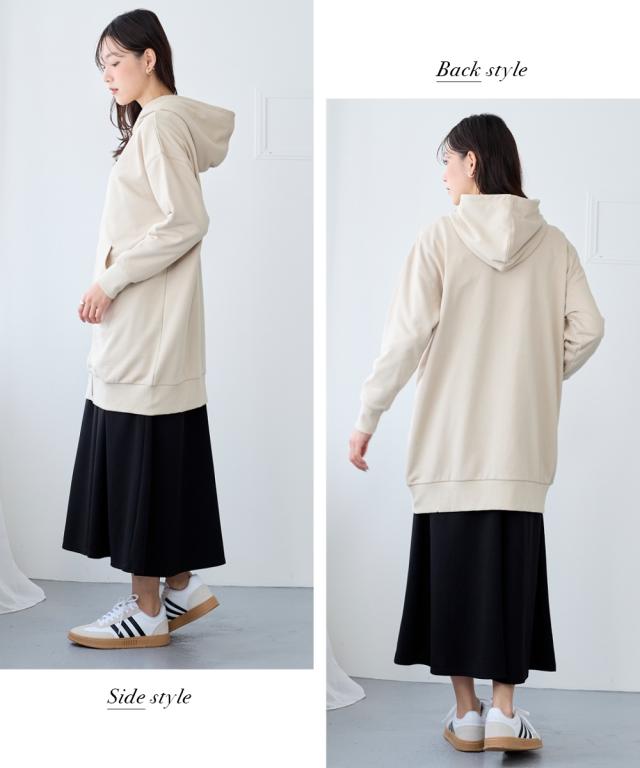 綿100%の優しい肌触り。ゆるっと楽な着心地で気になるところをしっかり隠してくれるロング丈パーカー。 ■デザイン シンプルなデザインで飽きがこず長く使えます。すこしゆるいシルエットなので着ていて楽です。袖周りとバストがゆったりしているので重ね着してもかさばらず窮屈感ゼロ。便利なポケット付き。 ■素材 厚すぎないスェット素材で夏以外、使えます。肌触りの良い安心の綿100%素材です。柔軟加工しているのでチクチクガサガサしにくく柔らか。 ■おすすめのスタイリング 長すぎない丈なので細身のパンツと合わせても可愛いですし、フレアボトムやロングスカートやワイドパンツとも相よくかわいいです。ニットからTシャツまでゆったりしたシルエットのものまで幅広く重ねてももたつかずスッキリ着用できます。