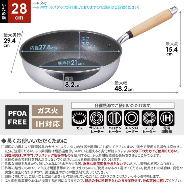 材質:本体/アルミニウム合金 内面/ふっ素樹脂加工 底面/ステンレス板 取っ手/天然木