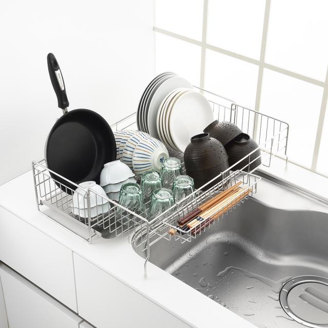 スライド式なので、洗い物の量に応じて便利に使えます。斜めトレーでシンクに直接流れていきます。
