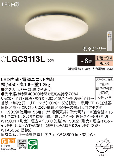 Panasonic パナソニック LGC3113L 天井直付型 LED(電球色) シーリングライト リモコン調光・カチットF 〜8畳