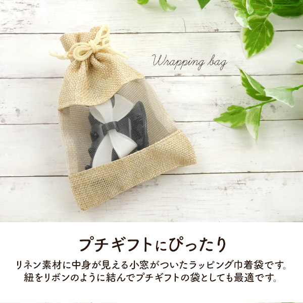 プチギフトにぴったり!中身が見えるリネン素材の小窓付き巾着袋です。紐をリボンのように結んでギフト包装に最適です。