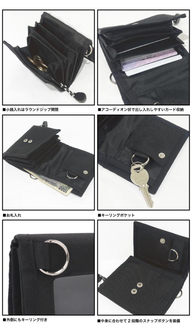 ・お札入れ、カードポケット、フリーポケット(マチ有り)×2、クリアカードポケット×1