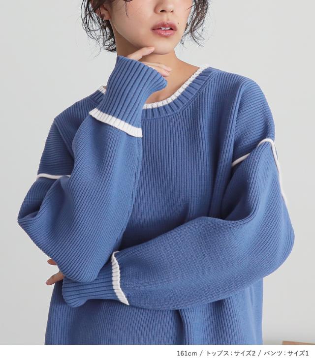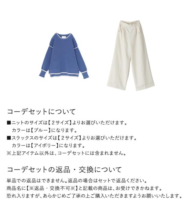 『配色ラインニット×タックワイドスラックスコーデ2点SET』【メール便不可】【60】[2点コーデセット 2025 レディース ニット 長袖 配色 もちもち ワイドパンツ ロング丈 ストレート センタープレス]