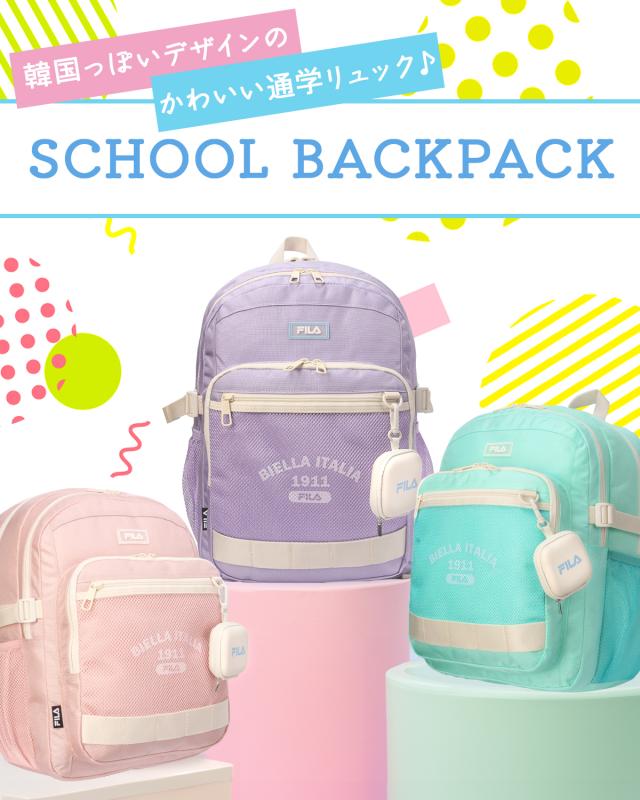 | 大人気ブランドのFILAから、パステルカラーで韓国っぽいデザインの「ルミノ」シリーズが登場! ティーンに流行中の韓国風デザインを施したスクールデイパック♪ パステルカラー使用した5色展開で好きなカラーが選べて、他の人と被りにくいのもうれしいポイントです。自分の好きな推しカラーやお友達と合わせても可愛い!毎日の通学を明るく楽しく過ごせるようサポートしてくれます。 荷物が多い学生には嬉しい機能がたくさん。 メインルームには、A4サイズ〜B4用紙サイズまで収納可能で内装にはウレタンポケットを搭載。授業で使う電子機器類を衝撃から保護します。背面には、盗難リスクを抑えるシークレットポケット、本体正面に推しグッズを収納できるメッシュポケットも備わっています。付属には、イヤホンや鍵・アクセサリーなどの小物が収納できるブランドロゴ入りセミハードケース付き。その他の機能面も充実しています。 生地は急な雨や汚れにくい撥水加工を施したナイロンを使用。 制服やカジュアル・スポーティー・フェミニンスタイルまで、幅広いコーディネートにマッチします。 |