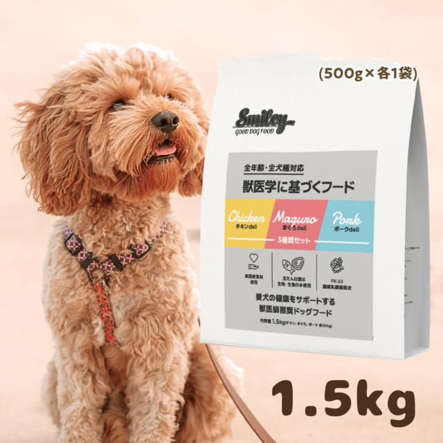 スマイリー 国産 チキン ポーク まぐろ 3種セット 1.5kgドッグフード 純国産 無添加 Smiley 犬 デリ 日本製 ペットフード 原材料 こだわり 素材 フリーズドライ 減塩 無着色 ノンオイル 一般食 わんちゃん ごはん 肉 魚 ビタミン アミノ酸