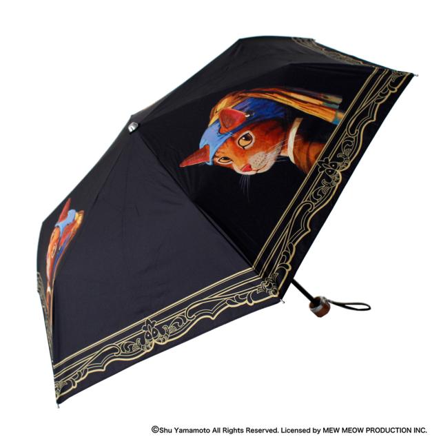 キャットアート 晴雨兼用 折りたたみ傘(傘袋付き)真珠のイヤリングをした少女猫/ヨハネス・フェルネーコ ブラック【CAT ART】