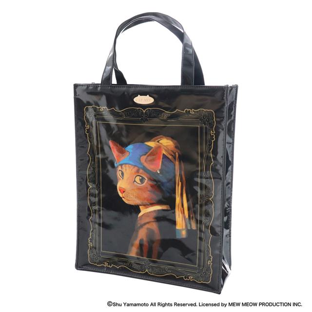 キャットアート ファスナー付トートバッグ 真珠のイヤリングをした少女猫/ヨハネス・フェルネーコ ブラック【CAT ART】