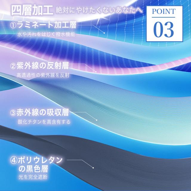 4層構造加工により完全遮光100%、UVCUT99.9%以上を実現。遮熱性も高く炎天下でもまるで木影のような涼しさ♪