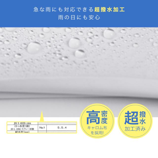 晴雨兼用、高撥水と急な悪天候にも素早く対応!素材にもこだわりがあり、シワになりにくいキャロム布を採用!常時キレイな状態でご使用いただけます。
