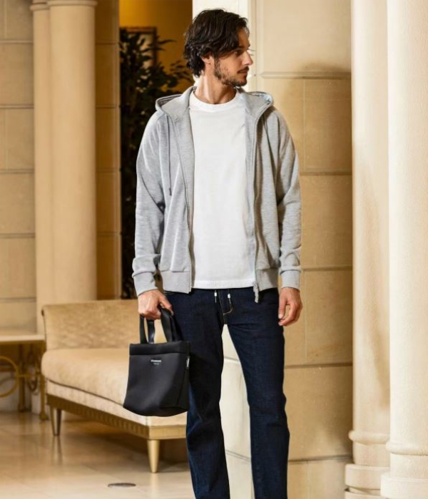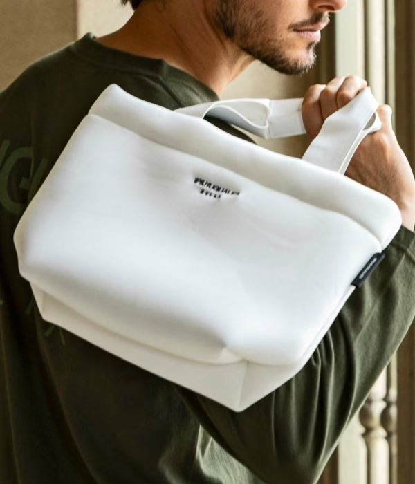 厚めの生地と程よい光沢がラグジュアリーな装いを演出するアイテム。コントラストの効いたカラーでブランドロゴを配置したシンプルなデザインは使い勝手の良いデザインです。