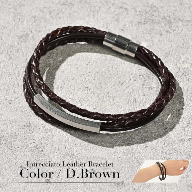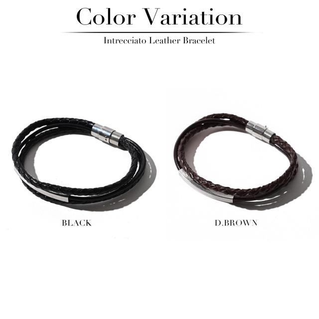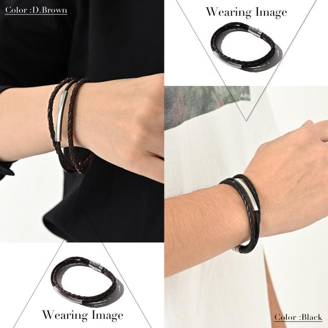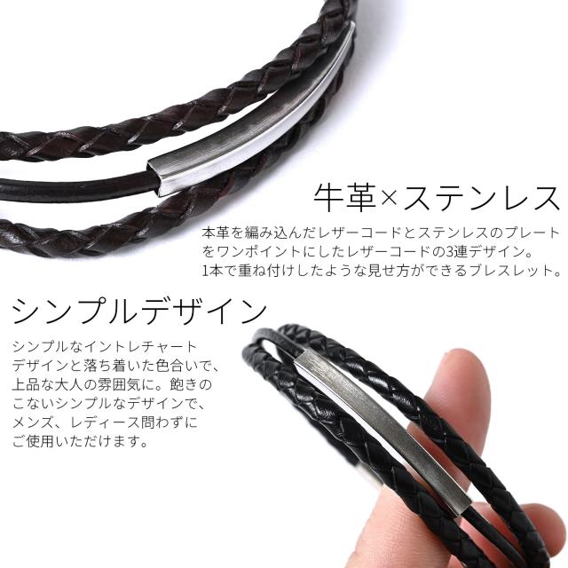 本革を編み込んだレザーコードとステンレスのプレートをワンポイントにしたレザーコードの3連デザイン。