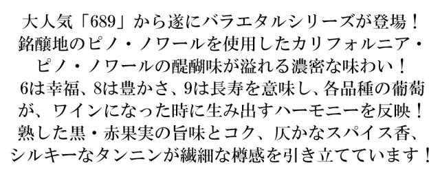 大人気「689」から遂にバラエタルシリーズが登場! 銘醸地のピノ・ノワールを使用したカリフォルニア・ ピノ・ノワールの醍醐味が溢れる濃密な味わい! 6は幸福、8は豊かさ、9は長寿を意味し、各品種の葡萄 が、ワインになった時に生み出すハーモニーを反映! 熟した黒・赤果実の旨味とコク、仄かなスパイス香、 シルキーなタンニンが繊細な樽感を引き立てています!