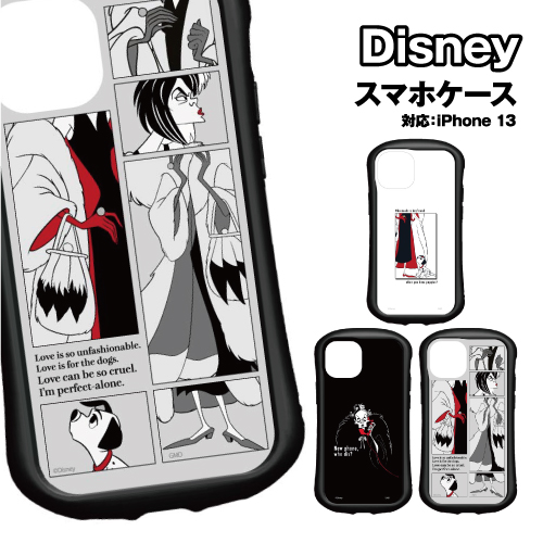 ディズニーキャラクター iPhone13対応 ハイブリッドガラスケース DN-937 / クルエラ&ラッキー テレフォン クルエラ・ド・ヴィル