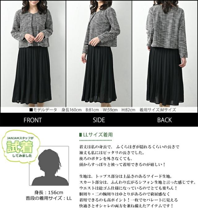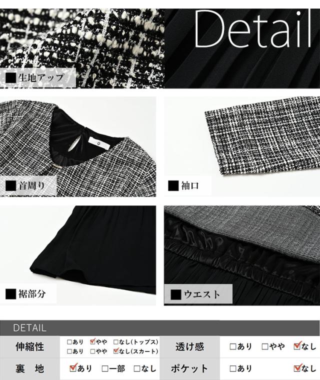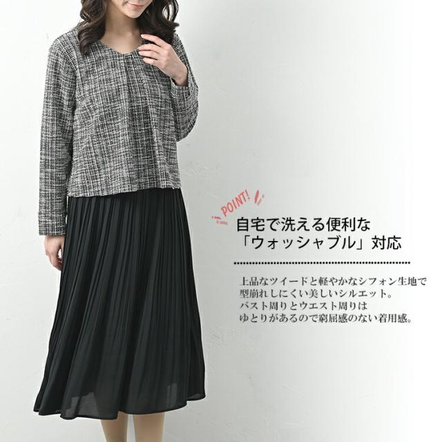 上品なセパレートに見える ドッキングワンピース。 上品なツイードと軽やかなシフォン生地で 型崩れしにくい美しいシルエット。 自宅で洗えるウォッシャブル対応が嬉しい1枚です。 |