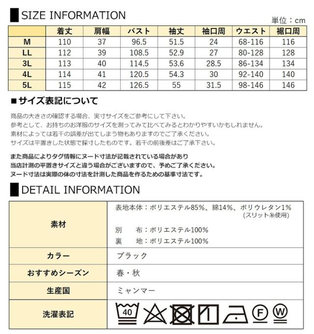 3L:着丈113 肩幅40 バスト114.5 袖丈53.6 袖口周28.5 ウエスト86-134 裾周134