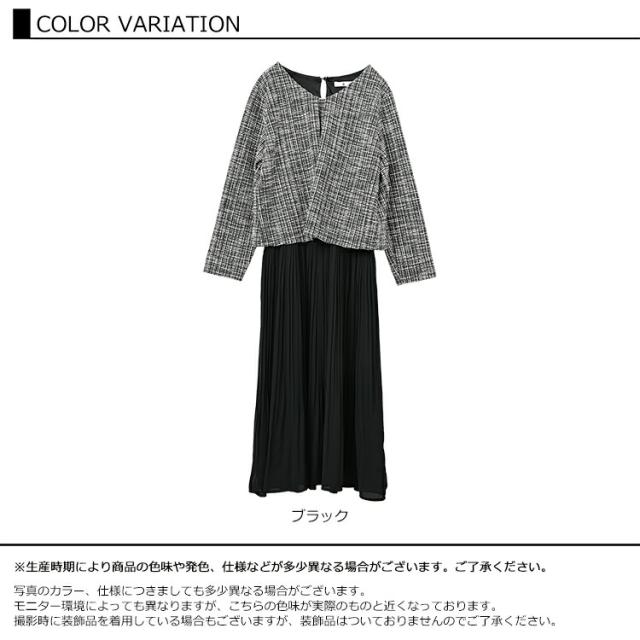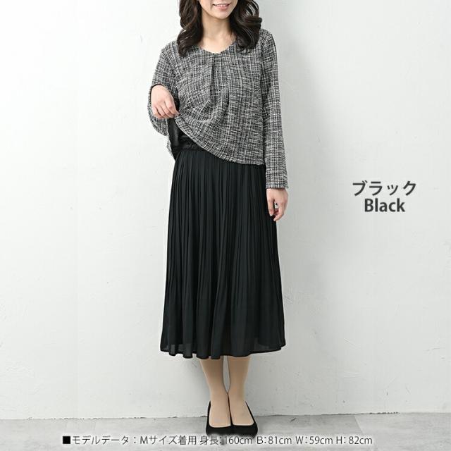 送料無料※沖縄/北海道対象外 大きいサイズ レディース ドッキングワンピース ツイード×プリーツ ロング丈 長袖 重ね着風 sfm M/LL/3L/4L/5L ゆったりサイズ ぽっちゃり女子 プラスサイズ