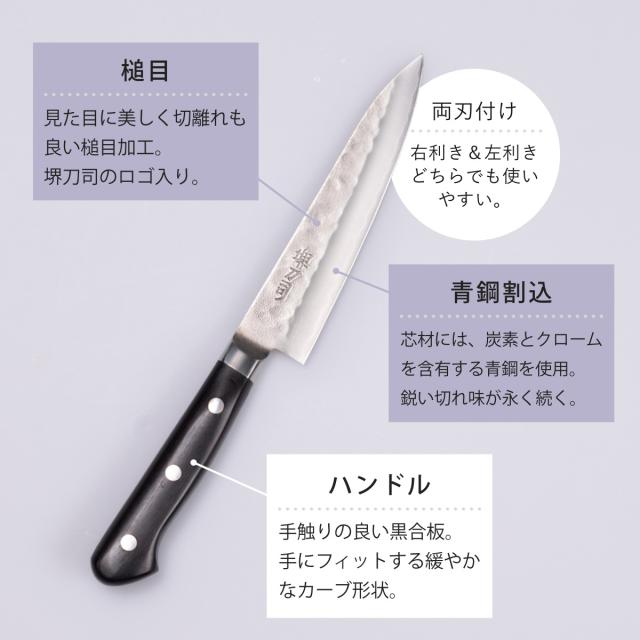 ペティナイフ 12cm 青鋼鍛造本割込 堺刀司 日本製 ( 包丁 果物包丁 果物ナイフ 小型包丁 キッチンナイフ ナイフ 高級包丁 割り込み包丁 青紙 三層鋼 槌目加工 120mm 両刃 切れ味抜群 調理小物 調理道具 下ごしらえ用品 )