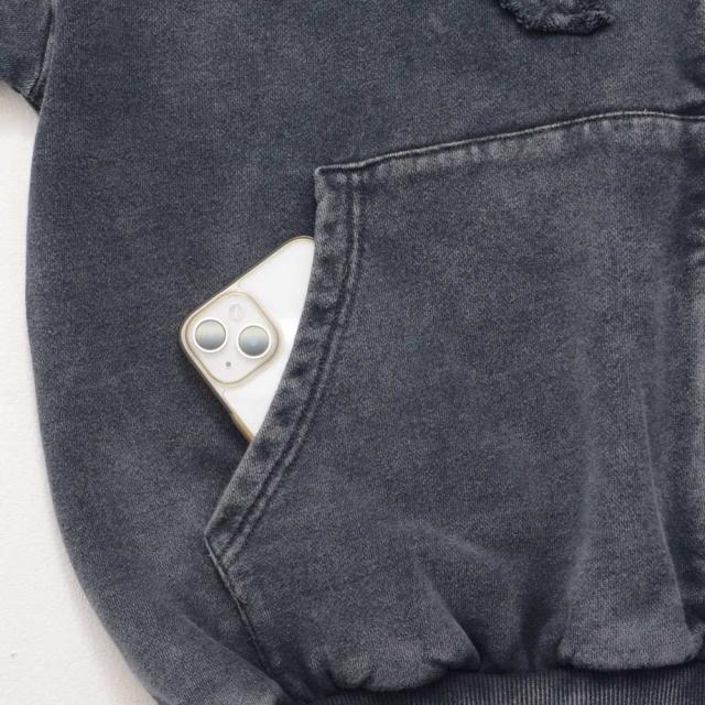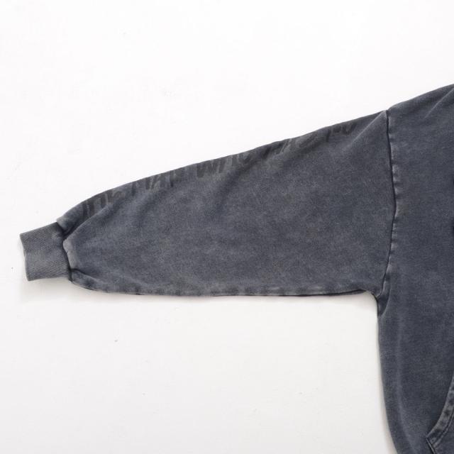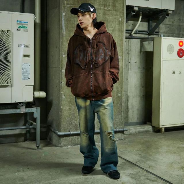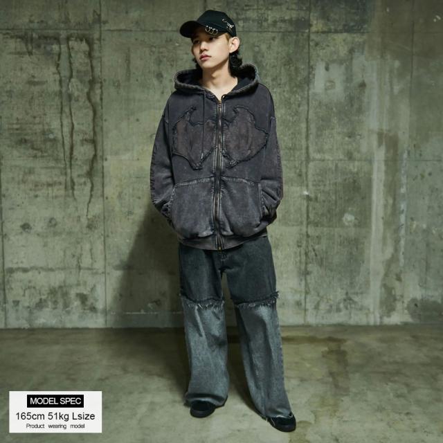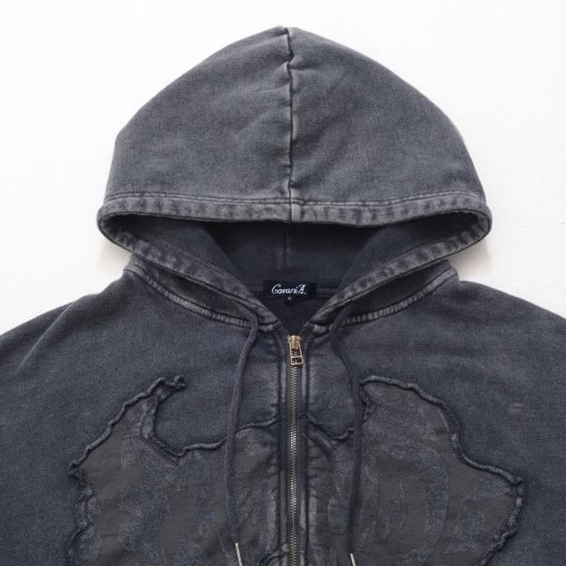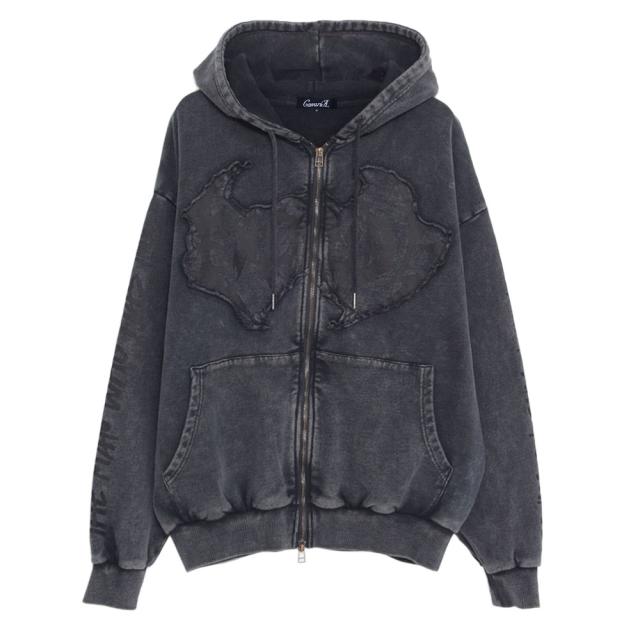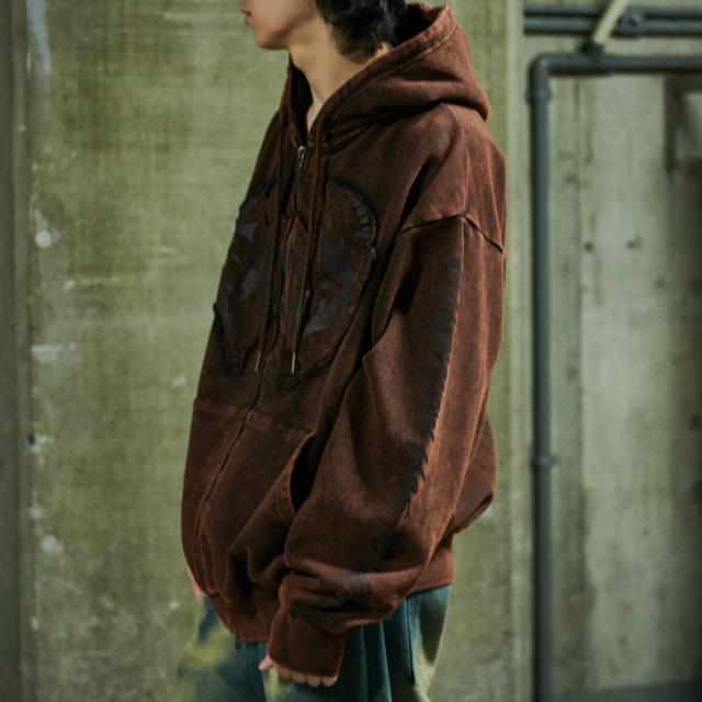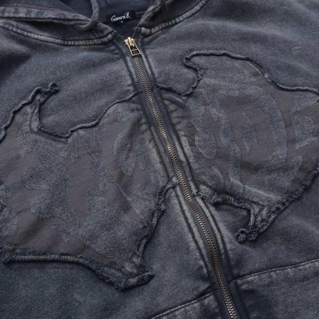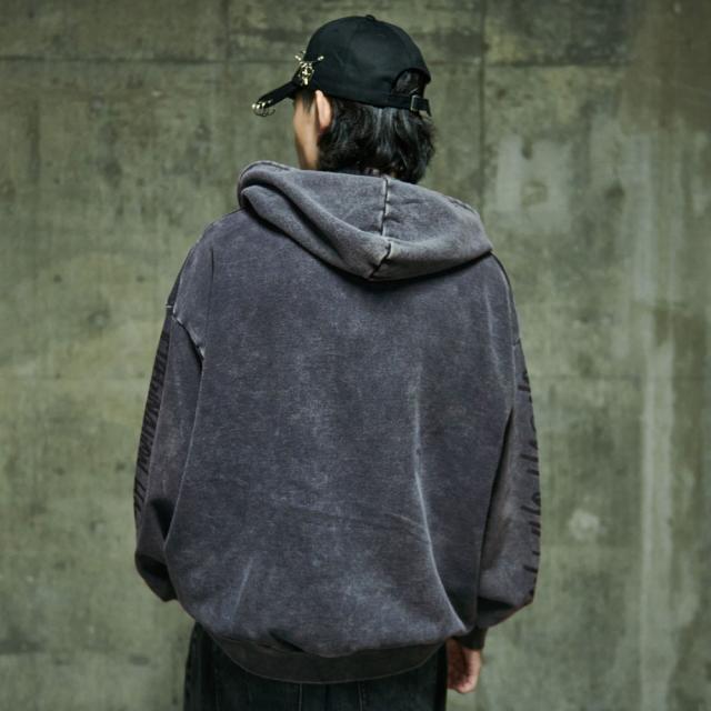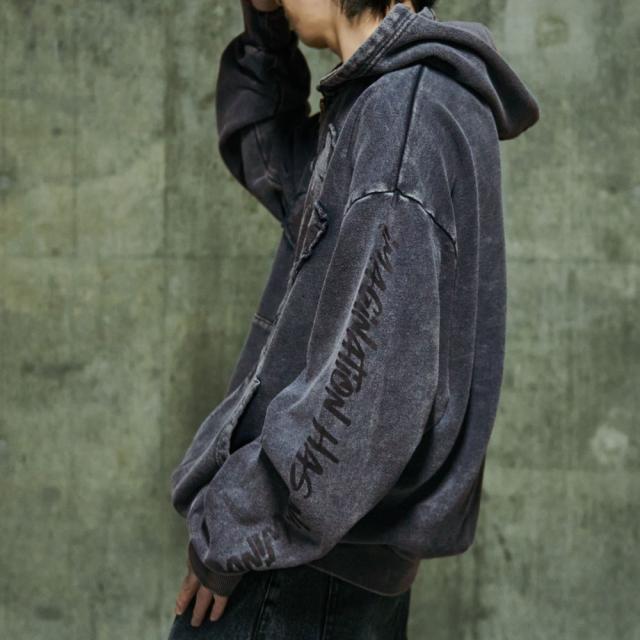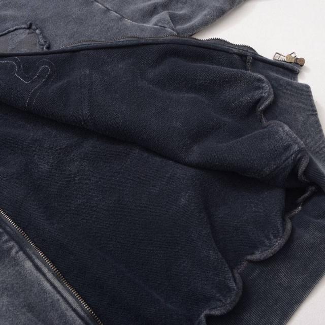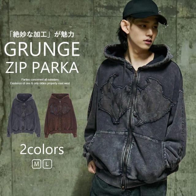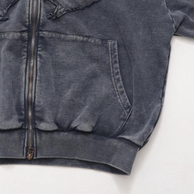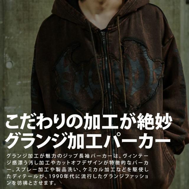 グランジ加工が魅力のジップ長袖パーカーは、ヴィンテージ感漂う汚し加工やカットオフデザインが特徴的なパーカー。