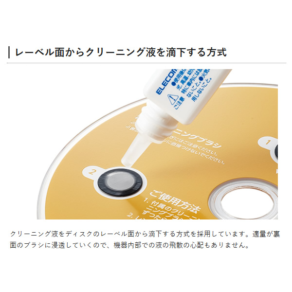 クリーニング液をディスクのレーベル面から滴下する方式を採用しています。適量が裏面のブラシに浸透していくので、機器内部での液の飛散の心配もありません。