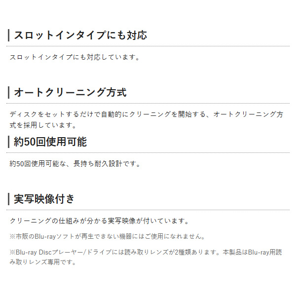 ※Blu-ray Discプレーヤー/ドライブには読み取りレンズが2種類あります。本製品はBlu-ray用読み取りレンズ専用です。